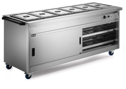 - Thermostatically controlled bain marie top can be operated with wet or dry heat. Accurate digital electronic control of the hot cupboard temperature, adjustable between 20 and 99 °C, ensures compliance with food hygiene regulations