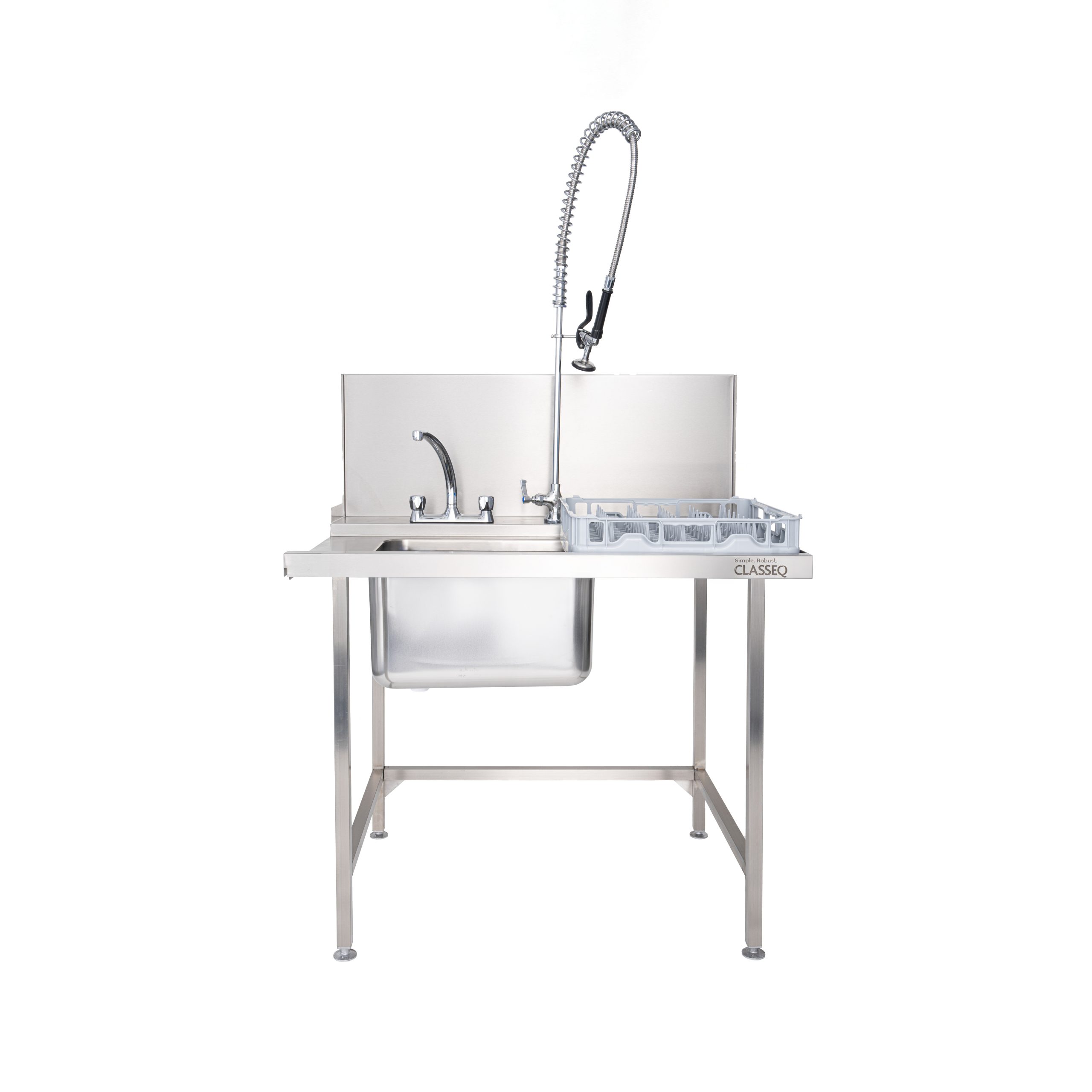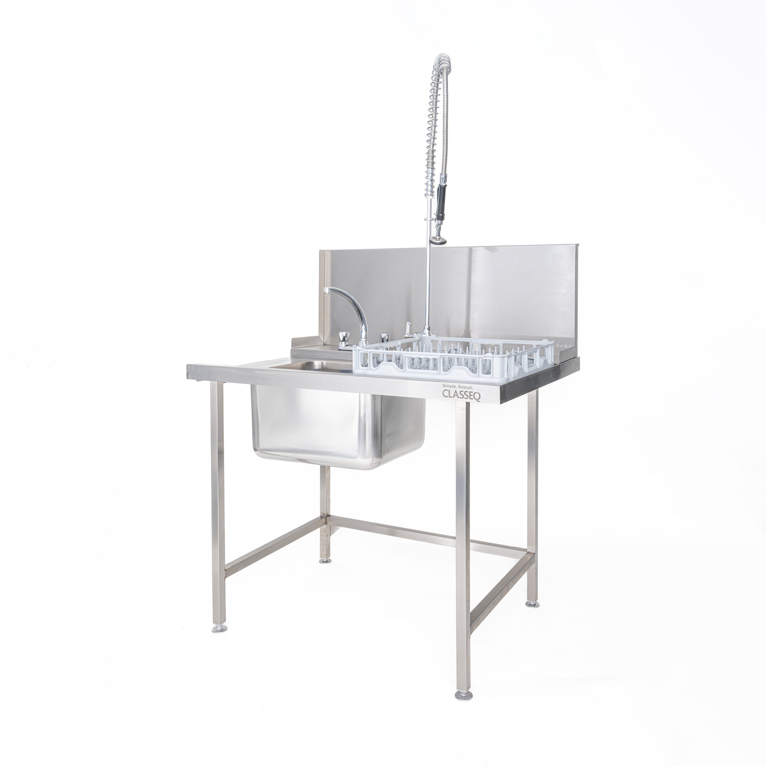 The Classeq T11SEN Entry Table includes sink bowl, splashback, pre-rinse spray arm and mixers taps. Ideal when purchasing a Classeq CP500 pass-through dishwasher. Made from durable stainless steel, it is easy to clean and built to last. With a 1100mm length, it comfortably accommodates two 500mm baskets, making loading efficient.