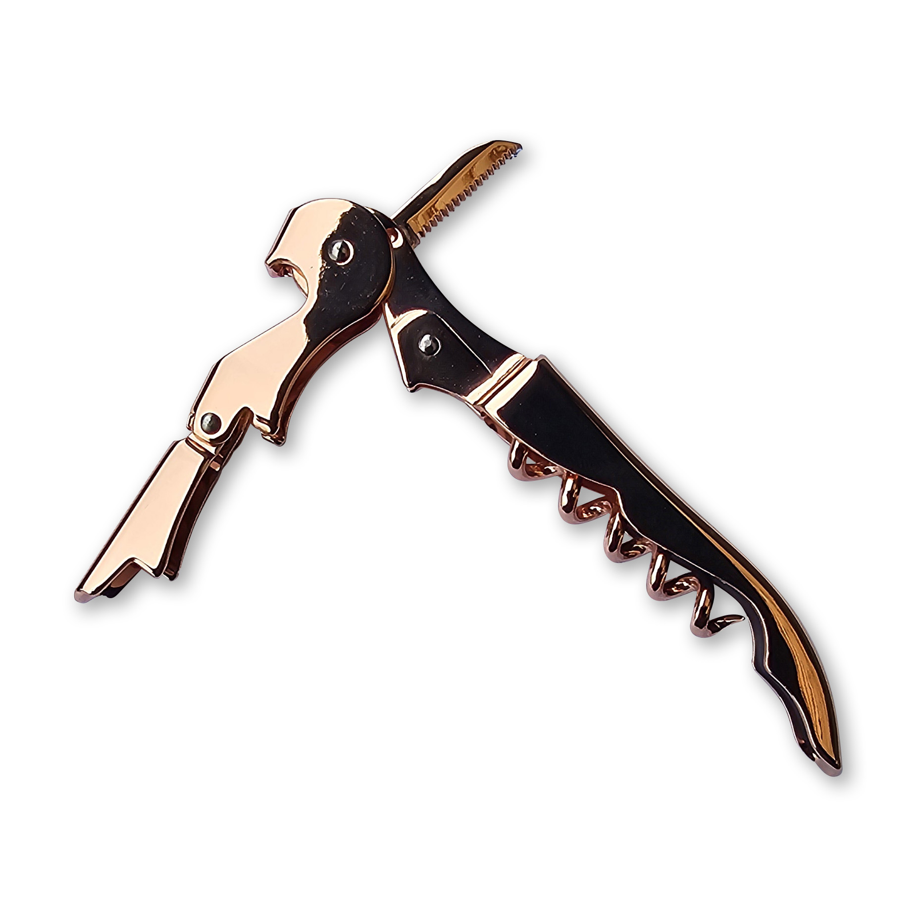 The Copper Plated Double-Reach Corkscrew is an essential tool for any professional or home bar. The copper plated finish gives a distinct look of flare and style. Not only is it a corkscrew but it also features a small blade for removing foil bottle wrappers. In addition to this it can be folded up and can fit easily into a waiters pocket.