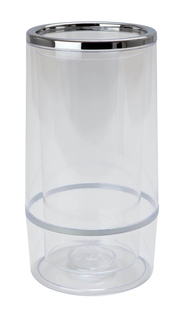 This chrome & plastic wine cooler is designed to keep a bottle of white wine cool at the table by way of its double skinned construction which traps the coldness of the chilled bottle in while insulating it against the warmer ambient air outside. Robust, durable and stylish makes this cooler a great choice for any professional bar or restaurant.