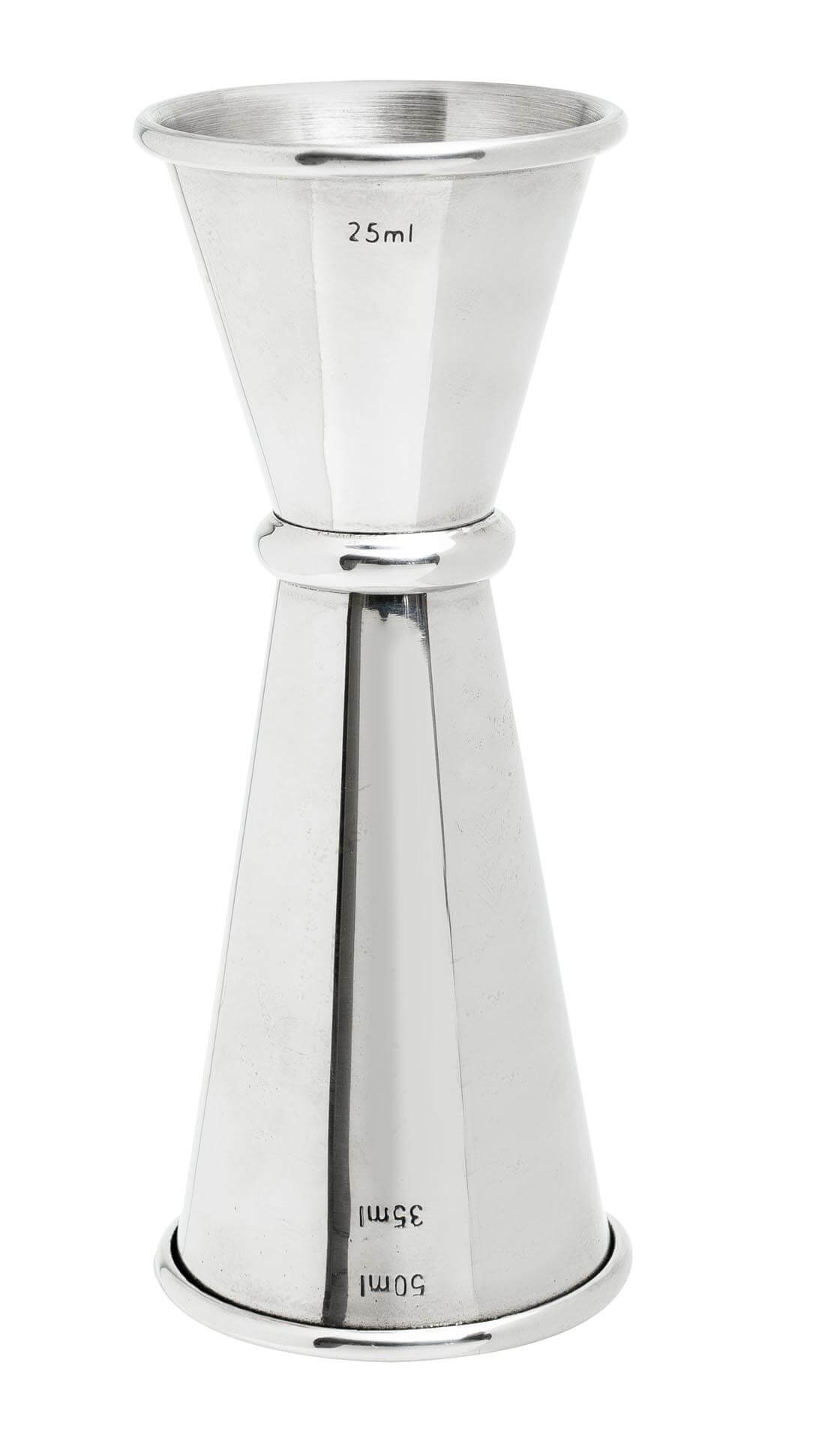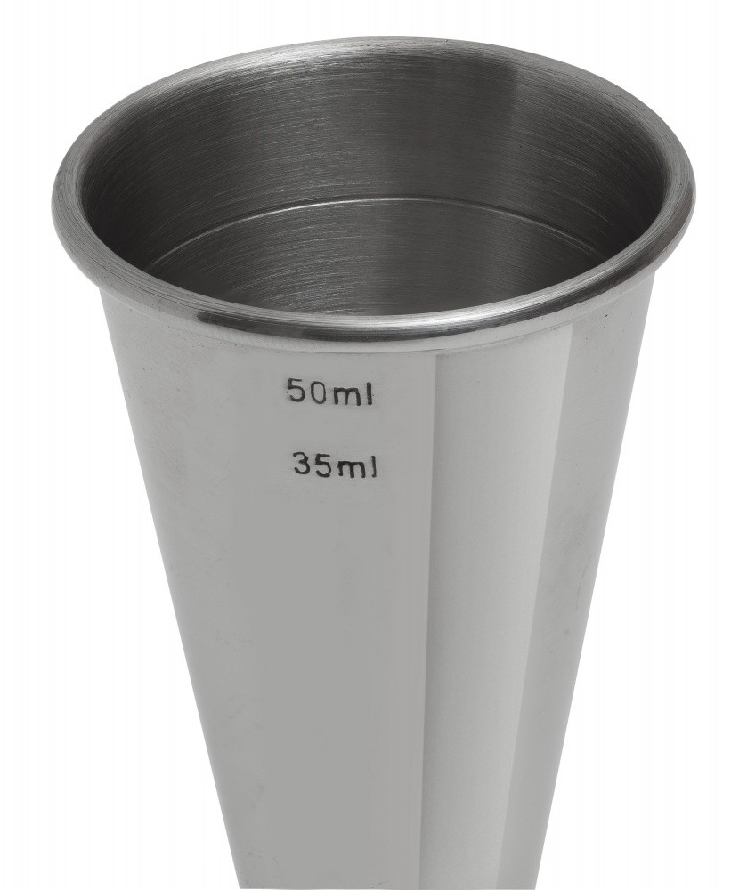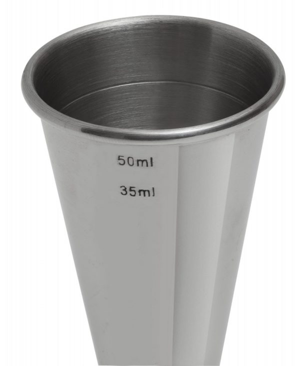 This Mezclar Banded 25ml/35ml/50ml professional stainless steel bar jigger is a double sided measuring cup with an internal 35ml line, allowing bartenders to quickly mix cocktails by using both sides of the jigger. Ideal for use by pubs, clubs and bars.
