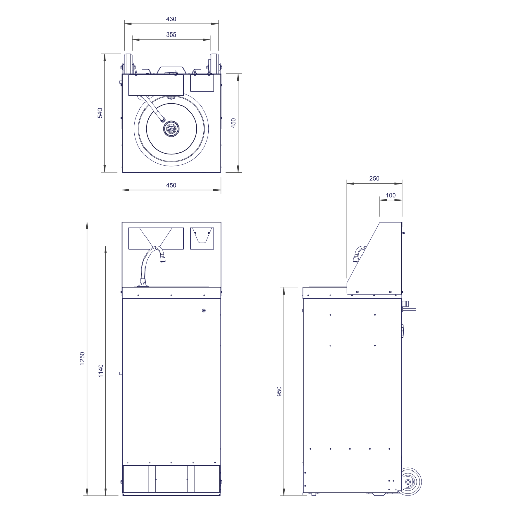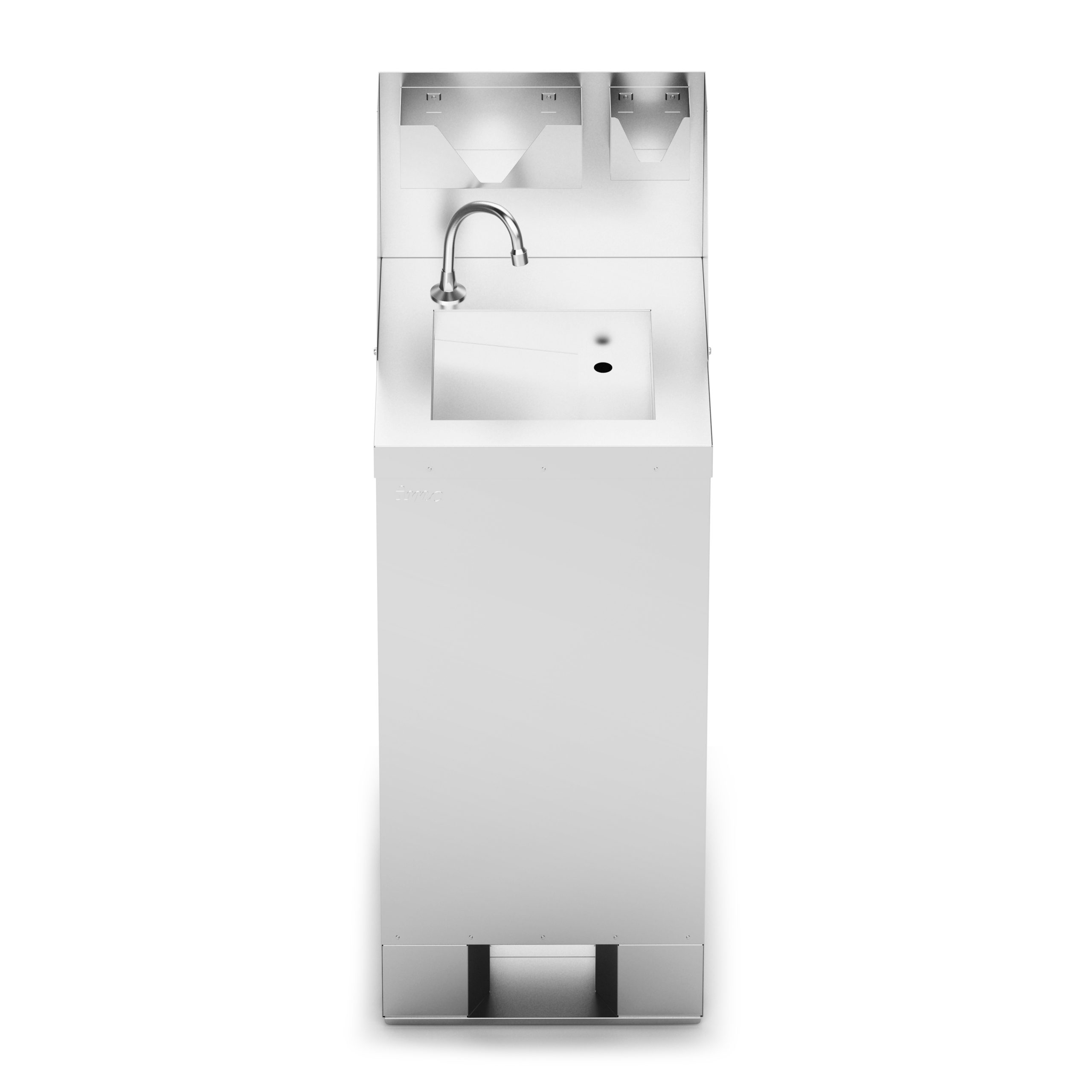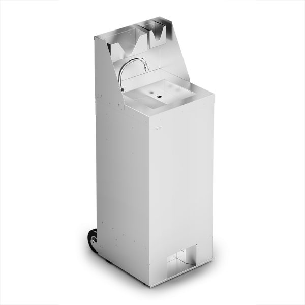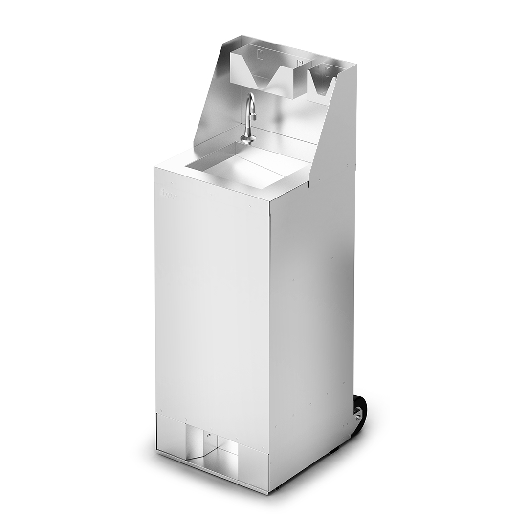 The sturdy, stainless steel unit comes with accessories – an integrated splash back and a built-in soap holder and towel dispenser, all of which are easy to wipe clean. The station is mounted on large wheels for quick and easy manoeuvring.