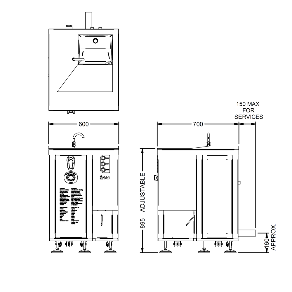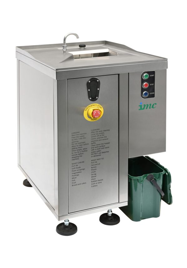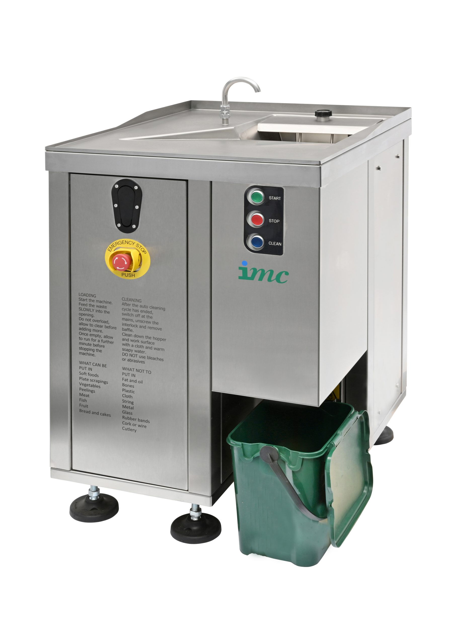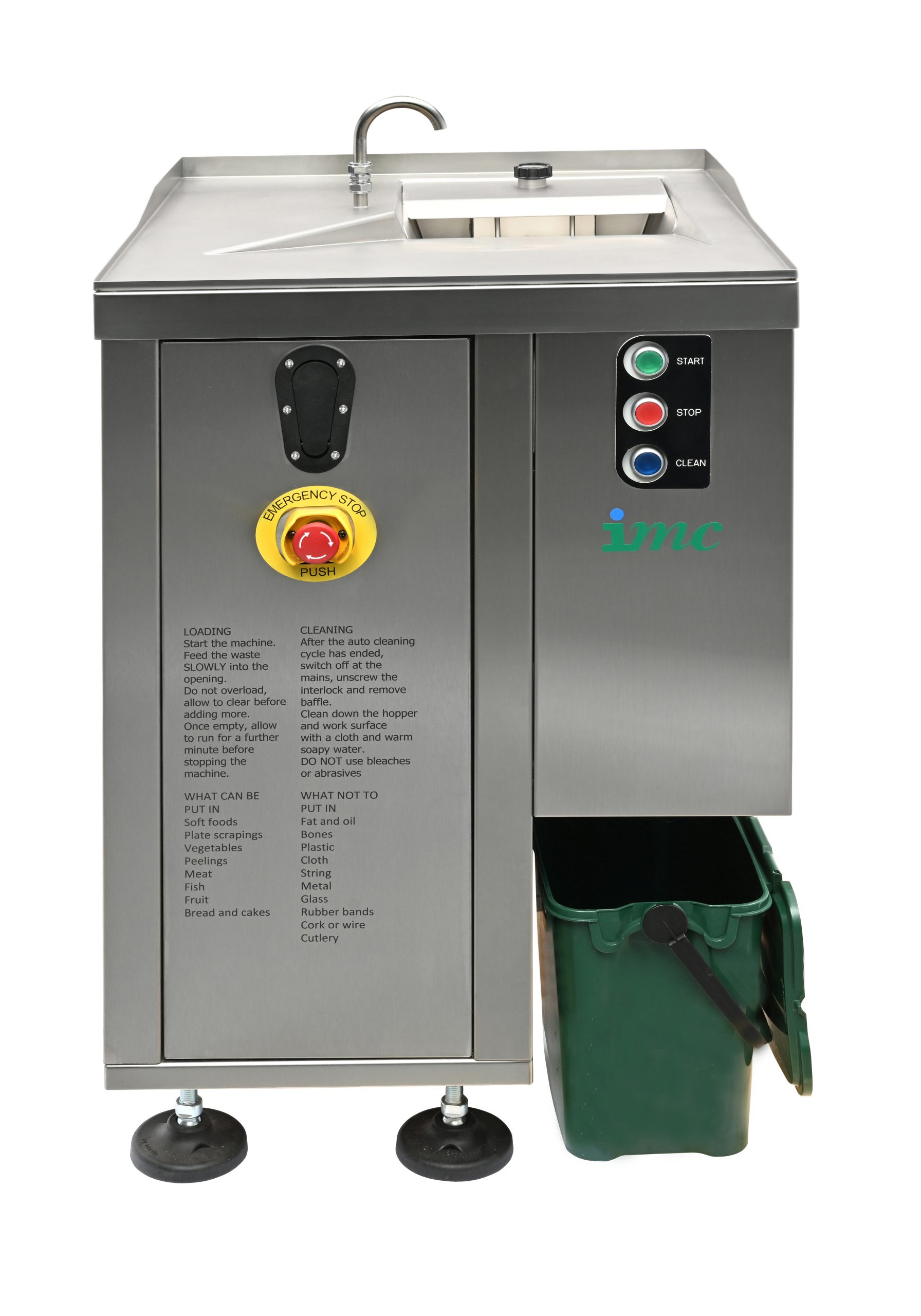 This “grey water” is fed directly to drain, the resulting solid fraction of the food waste is collected in small, easily managed, lidded bins, ready for onward processing.