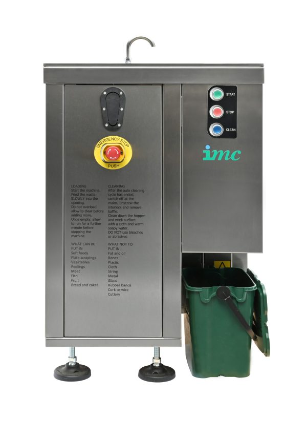 This “grey water” is fed directly to drain, the resulting solid fraction of the food waste is collected in small, easily managed, lidded bins, ready for onward processing.