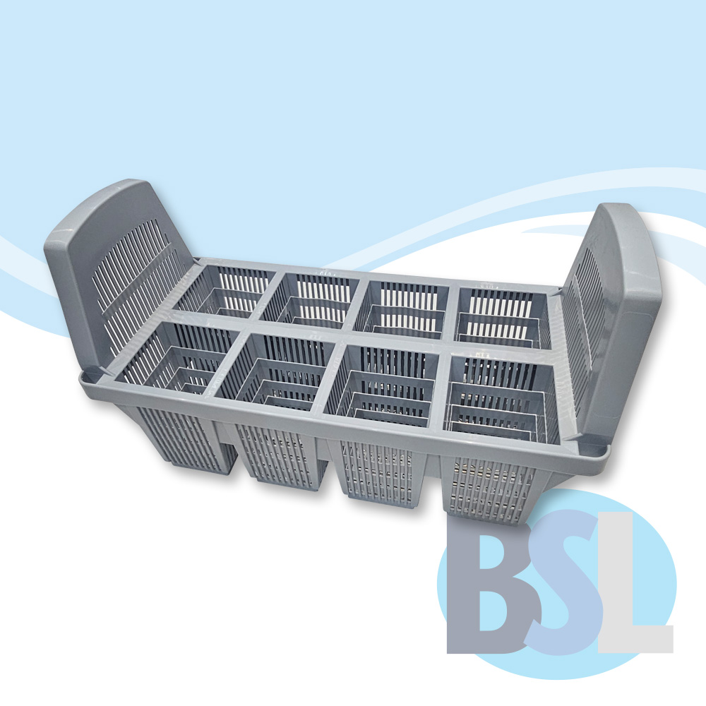 This 8-compartment cutlery insert fits neatly inside a standard 500mm² open basket and you can place two side by side. Washing cutlery upright in a proper basket delivers much better cleaning results. This is because the cutlery is upright therefore fully exposed to wash water rather than lying flat, which will shield water flow. Cutlery left lying down may also fall through the basket, potentially damaging wash arms or even pumps.