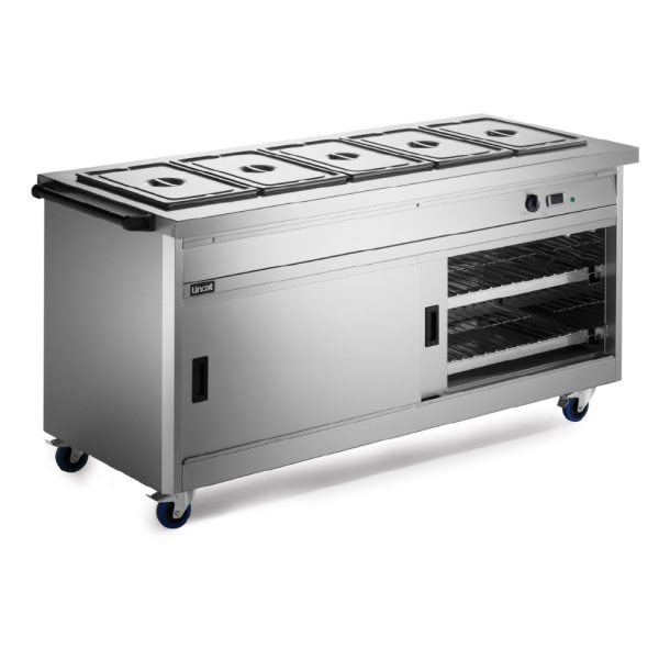 Helping to cater in demanding environments such as cafeterias, canteens and restaurants, the Panther 800 Series Hot Cupboard / Bain Marie is an effective way of holding food at the desired temperature, and is perfect for holding carvery and breakfast items either for self service or for back service. The unit is fan assisted, providing even heat distribution, fast heat up and recovery times, and lower energy usage. Built for efficiency, the model has sliding doors to both sides, providing enhanced workflow capability. Fully 1/1 GN compatible, this unit accomodates 5 x 1/1 GN containers up to 150mm deep, while the thermostatically controlled bain marie top can be operated with wet or dry heat. An accurate digital electronic control of the hot cupboard temperature, adjustable between 20 and 99 °C, ensures compliance with food hygiene regulations.