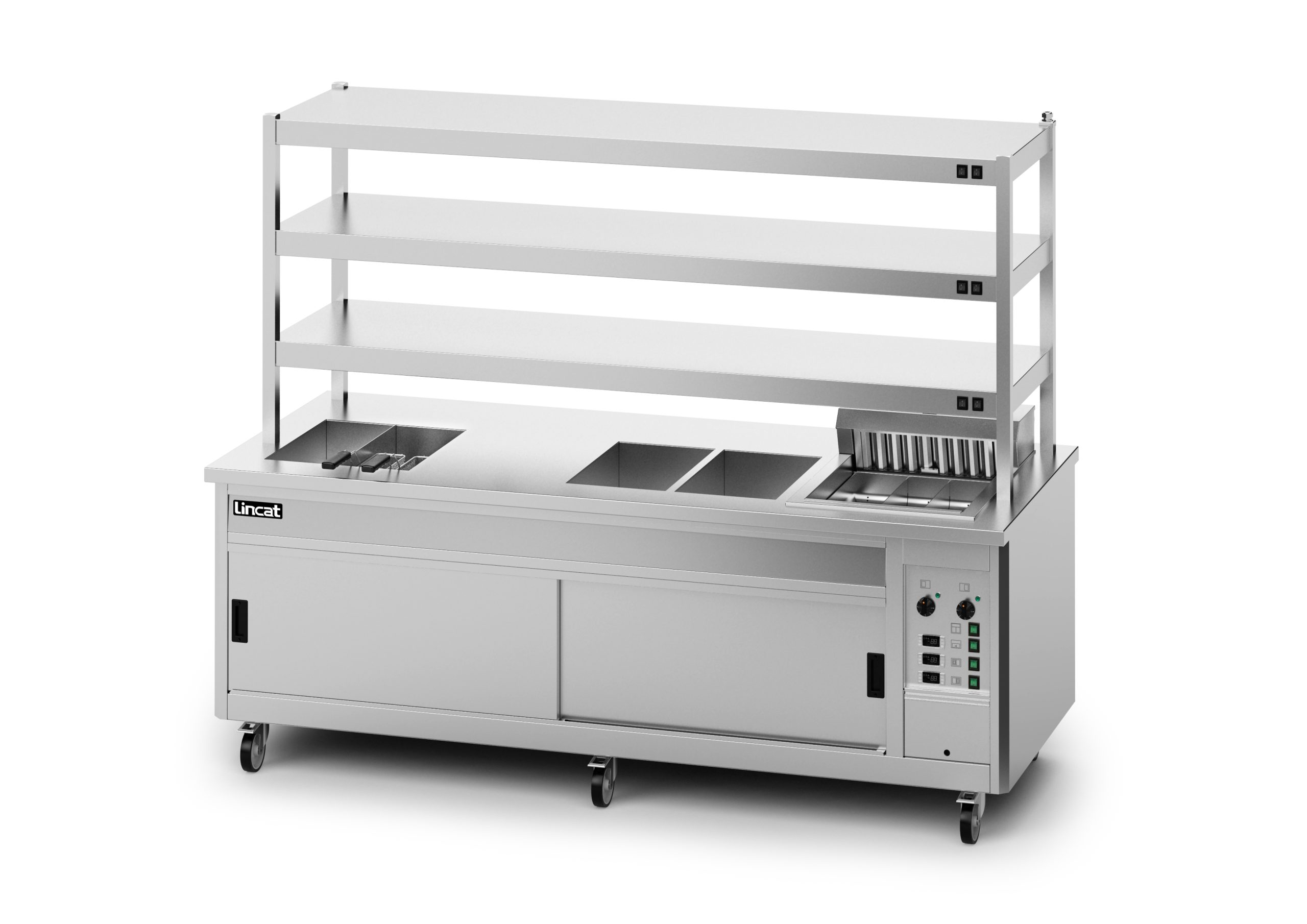 Offering unrivalled versatility, the Panther Super Pass Hot Cupboard is built for high demanding environments, with multiple hot holding and cooking functions in one mobile unit. The Super Pass includes a Carter Hoffmann Crisp ‘N Hold for holding chips and breaded products such as chicken nuggets, 2 x 1/1GN bain marie for hot holding sauces, soups, gravy and precooked foods and 2 x water tanks, suitable for boiling vegetables and pasta. With three tier heated gantries, the Super Pass is fully 1/1GN compatible accommodating 6 1/1 gastronorms and comes with a thermostatically controlled bain marie. It’s ideal for restaurants, hospitals or schools.