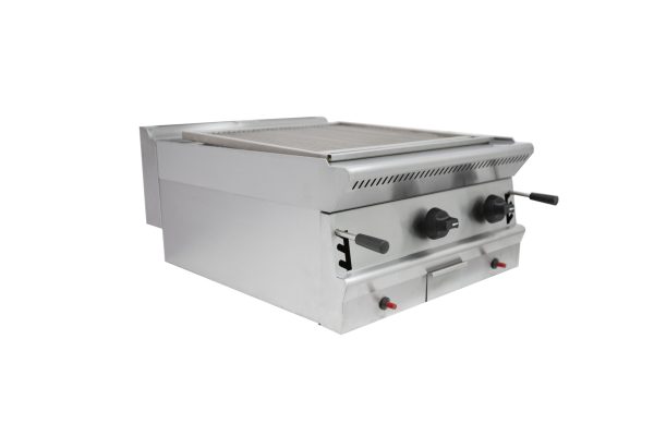 This Parry PGC6P LPG Gas Chargrill is ideal for commercial use in pubs, restaurants and kitchens. Features a no-stick high-grade stainless steel griddle, Piezo ignition, two powerful burners, automatic flame failure device, variable control (each half is individually controlled). Removable drip trays and Lava Rock included.