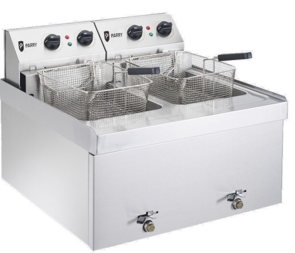 Parry NPDF9 Double Electric Fryer is a best-selling countertop fryer. Made in the UK this powerful 2 x 9kW per tank appliance is a reliable addition to any modern commercial kitchen. With functionality in every feature. The twin tank with twin baskets (2 x 9Ltr capacity) are easy to use and clean with front facing drain taps. Adjustable thermostatic controls for precise cooking. The sturdy stainless steel construction ensures durability and comes with two batter plates, lids and baskets.