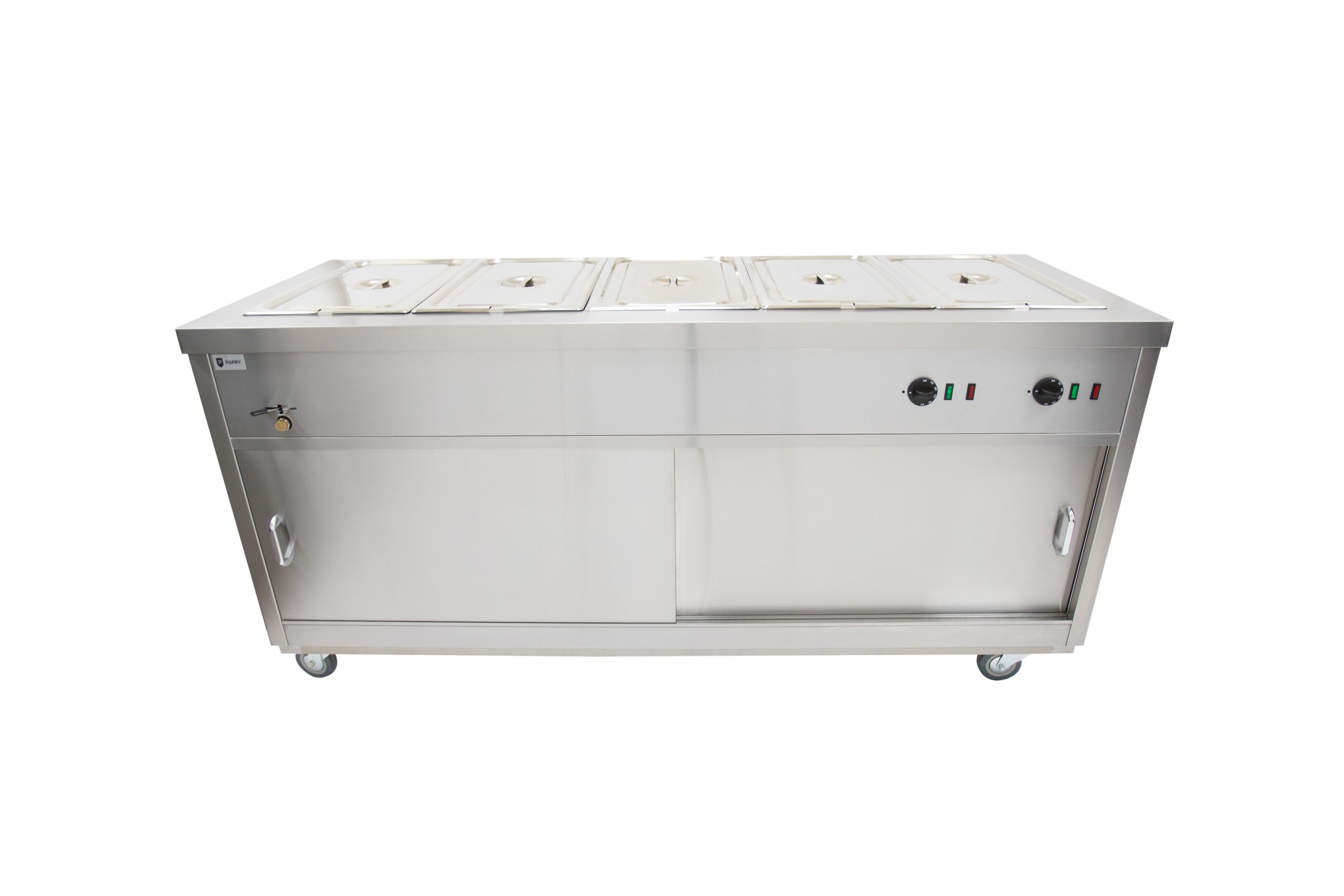 Ideal for care homes, restaurants or canteens, the Parry HOT18BM takes back-of-house heated storage of plates, meals and food to another level. Powerful and versatile, the bain marie topped hot cupboard keeps plates and meals at ready-to-eat temperatures. Packed with useful features, the bain marie is easy to use in wet or dry heat configuration and accommodates gastronorm compatiblepots. Once service is complete, the sliding doors, shelves and pans are all removable and the trolley is easy to clean.