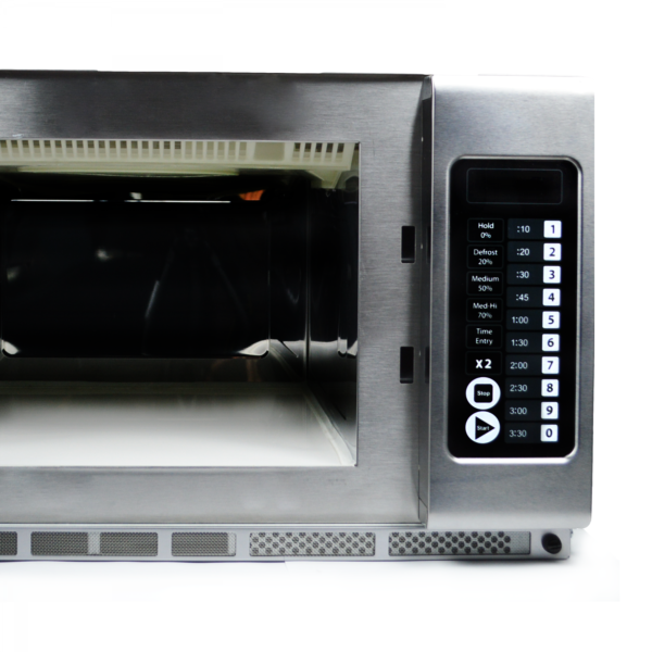 Manufactured with high-grade stainless steel, this microwave withstands daily heavy use while maintaining a professional appearance. The sturdy aluminium handle ensures easy operation, while the hinged glass door allows quick visual checks during cooking. Additionally, the membrane digital control panel offers simple navigation, making it a user-friendly choice for fast-paced kitchens.