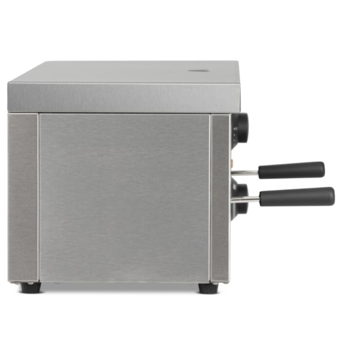 The adjustable chrome-plated grill rack includes handles for easy positioning and safe removal of food. The rack accommodates different dish sizes and supports even heat distribution across the surface. Beneath the grill, an integral crumb tray collects debris during cooking. Removing and cleaning the tray takes moments, keeping the unit hygienic and ready for the next order.