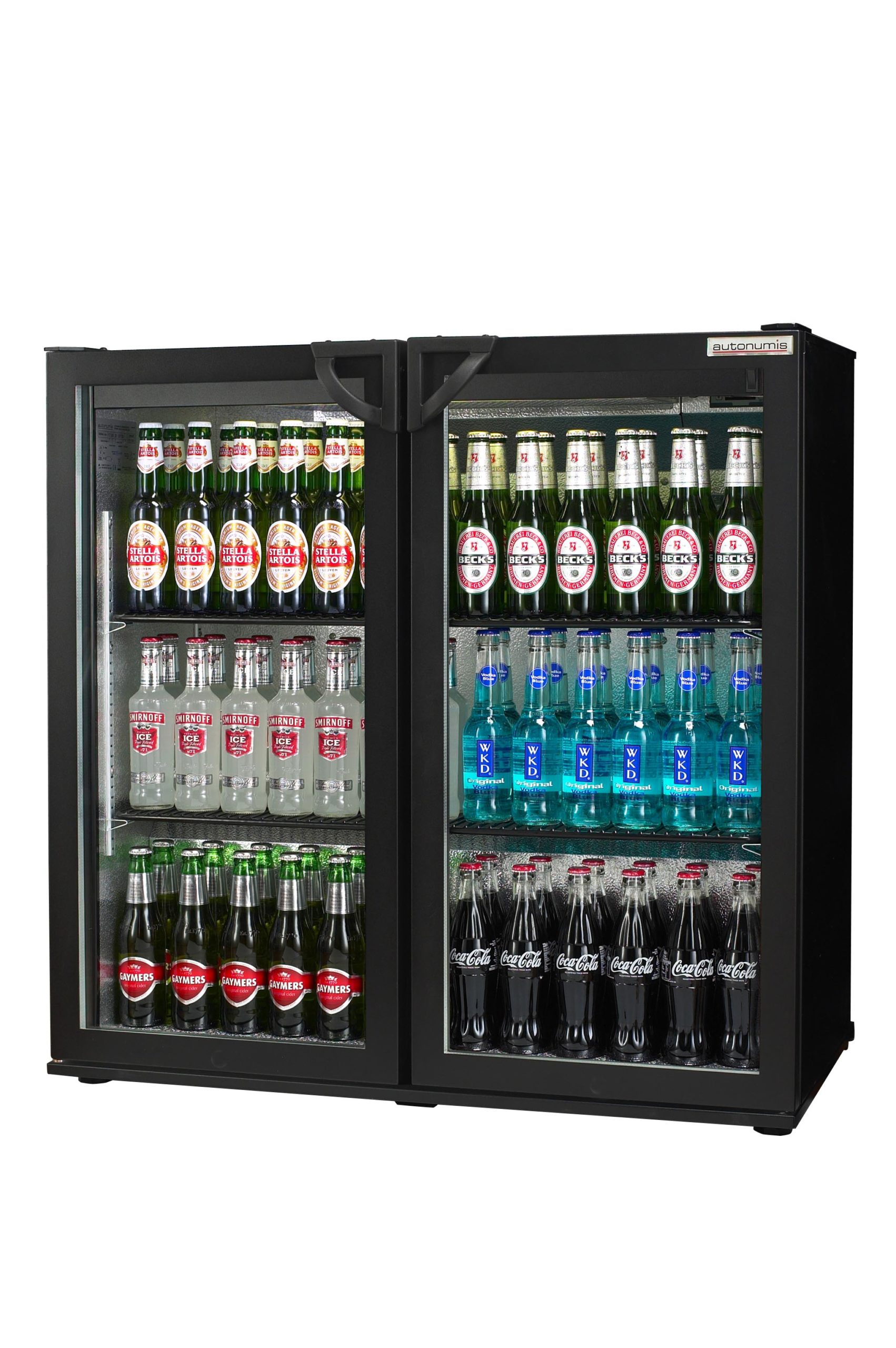 The Autonumis RPC00001 undercounter bottle cabinet is a double hinged door drinks cooler, finished in black and has been specially developed for back bar environments, ideal for use in pubs, clubs and restaurants. Fully illuminated internal LED lighting enhances the visual display of your best-selling bottled & canned products. This robust beer fridge with heavy duty compressor and fan assisted cooling gives rapid temperature pull down times which is crucial in busy establishments where bar staff need constant access to chilled products and are frequently opening the fridge doors allowing warm air in. This high-quality cabinet holds 174 x 330ml beer bottles or 288 x 330ml cans making it a great option behind any professional bar. With two adjustable full width shelves, double glazed doors, adjustable feet for levelling makes this is an excellent choice for any licenced venue.