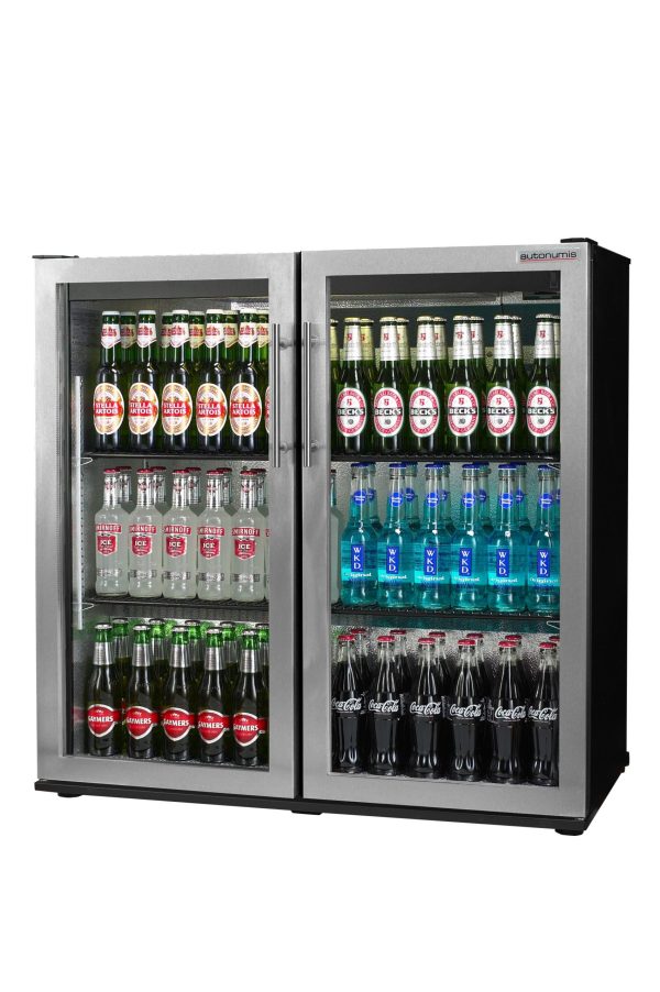 The Autonumis RPC00003 undercounter bottle cabinet has stainless steel double hinged doors and a black finished cabinet and has been stylishly developed for back bar environments, ideal for use in pubs, clubs and restaurants. Fully illuminated internal LED lighting enhances the visual display of your best-selling bottled & canned products. This robust beer fridge with heavy duty compressor and fan assisted cooling gives rapid temperature pull down times which is crucial in busy establishments where bar staff need constant access to chilled products and are frequently opening the fridge doors allowing warm air in. This high-quality cabinet holds 174 x 330ml beer bottles or 288 x 330ml cans making it a great option behind any professional bar. With two adjustable full width shelves, double glazed stainless steel doors, adjustable feet for levelling makes this is an excellent choice for any licenced venue.