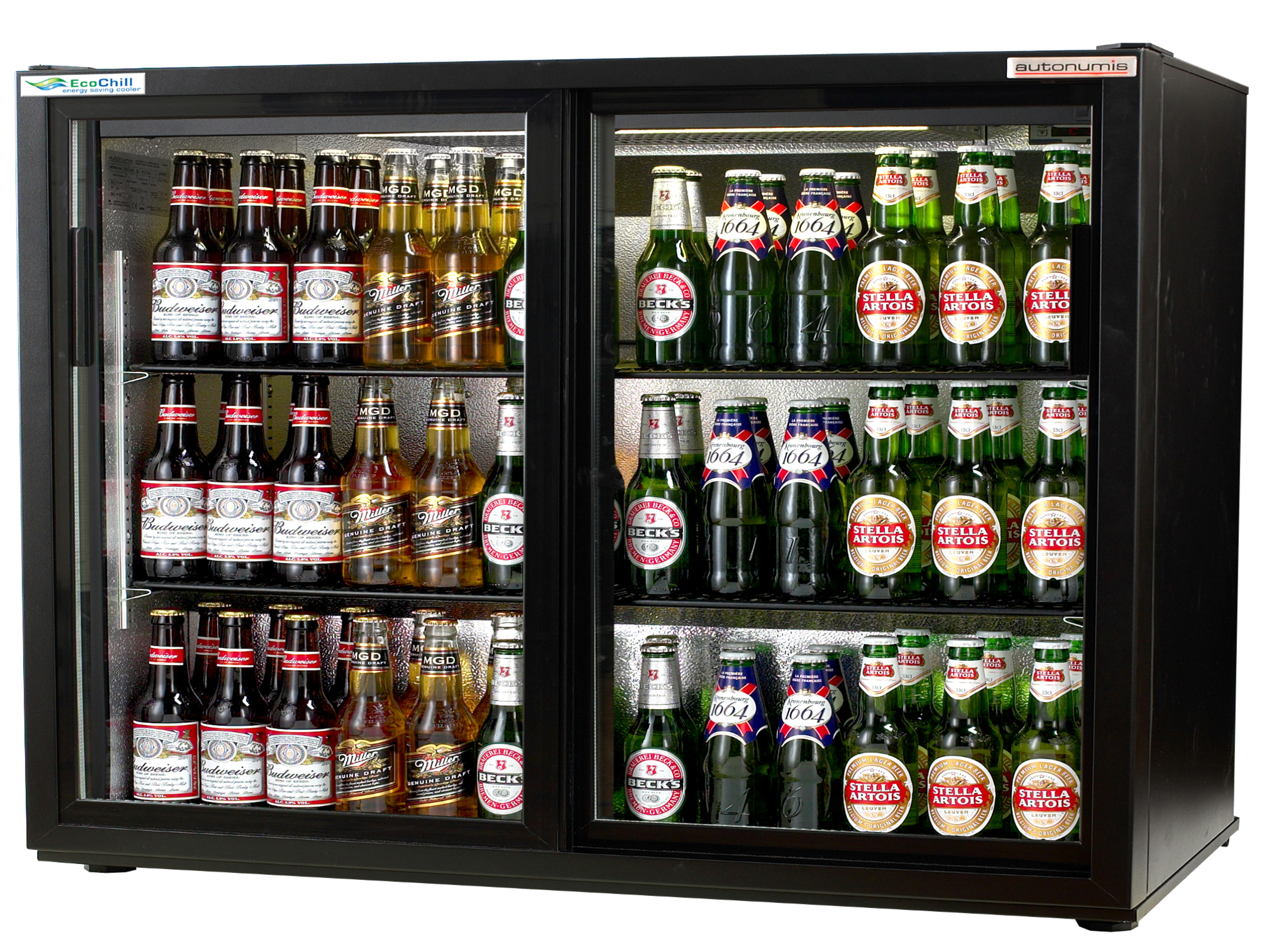 The Autonumis RWC10001 undercounter EcoChill Maxi bottle cabinet is an extra wide (1055mm), 2 door drinks cooler, finished in black and has been developed for back bar environments, ideal for use in pubs, clubs and restaurants. Fully illuminated internal LED lighting enhances the visual display of your best-selling bottled & canned products. This robust beer fridge with heavy duty compressor and fan assisted cooling gives rapid temperature pull down times which is crucial in busy establishments where bar staff need constant access to product and frequently opening the fridge door allowing warm air in. This high-quality cabinet holds 240 x 330ml beer bottles or 320 x 330ml cans making it a great option behind any professional bar, especially if space is limited. With two adjustable shelves, 2 double glazed sliding doors, adjustable feet for levelling this is an excellent choice for any licenced venue.