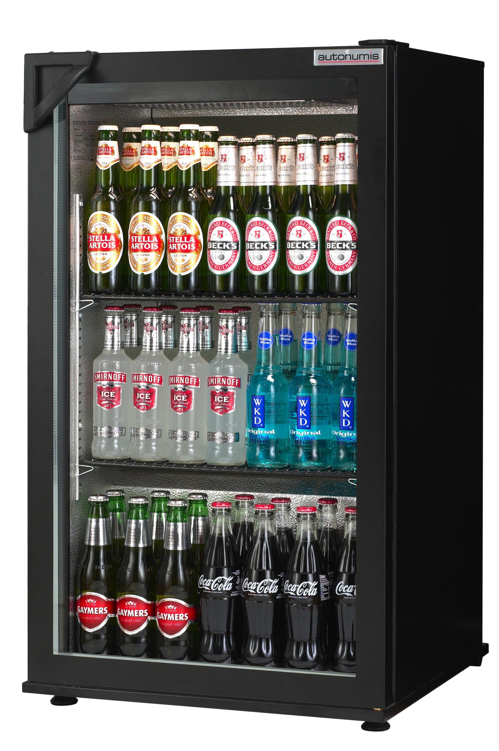 The Autonumis RNC00001 undercounter bottle cabinet is a slimline (525mm wide) single door drinks cooler, finished in black and has been developed for back bar environments, ideal for use in pubs, clubs and restaurants. Fully illuminated internal LED lighting enhances the visual display of your best-selling bottled & canned products. This robust beer fridge with heavy duty compressor and fan assisted cooling gives rapid temperature pull down times which is crucial in busy establishments where bar staff need constant access to products and are frequently opening the fridge door allowing warm air in. This high-quality cabinet holds 87 x 330ml beer bottles or 144 x 330ml cider cans making it a great option behind any professional bar, especially if space is limited. With two adjustable shelves, a double glazed single door, adjustable feet for levelling this is an excellent choice for any licenced venue.