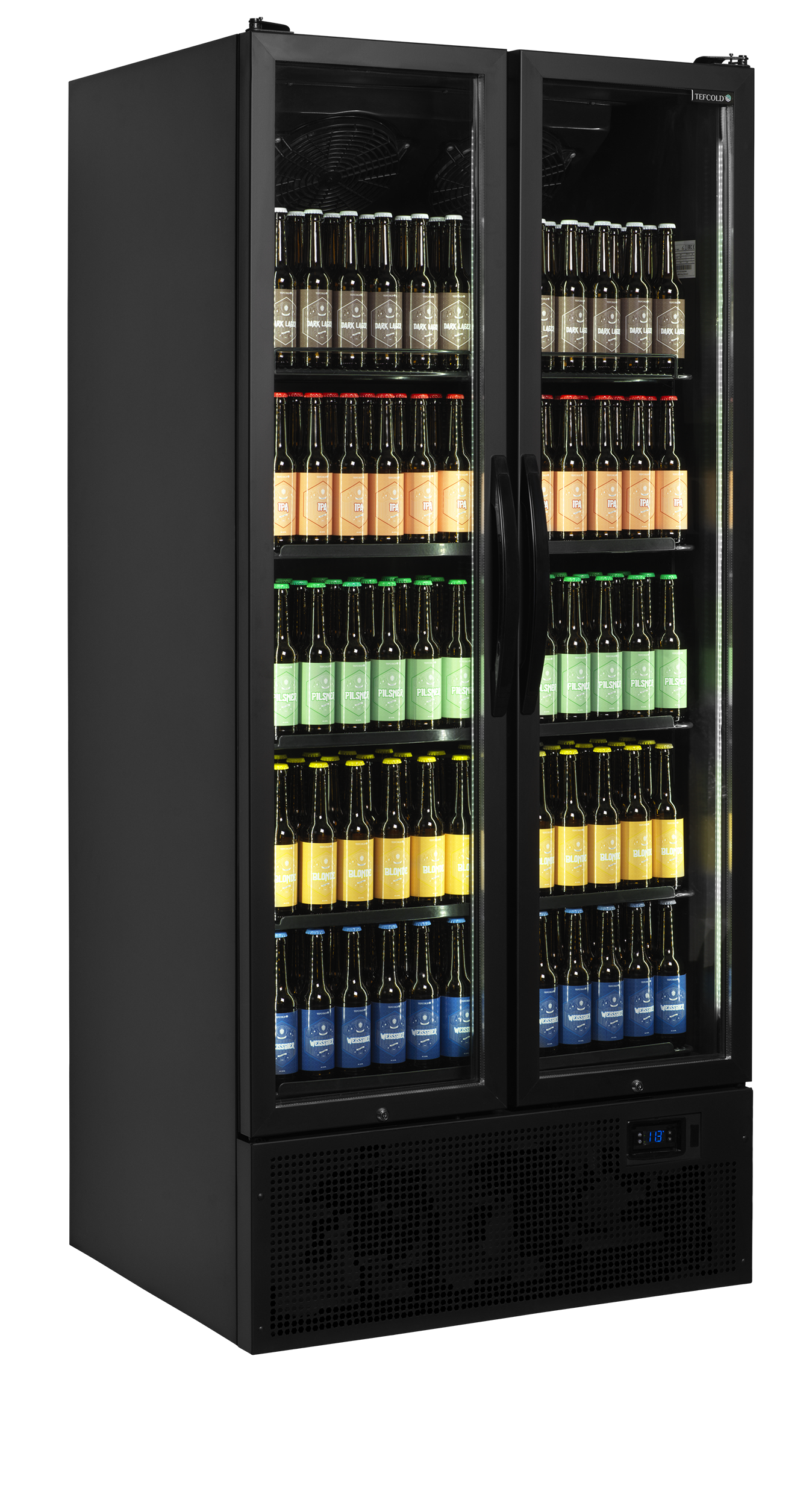 An excellent choice of double door display chiller, hacing no ligh canopy enable it to have a little more interior height and makes for a cleaner looking cabinet. With TEFCOLD’s build quality and reliability as standard, this style of cabinet has become a popular choice for shops and cafés, pubs and bars. The black interior and exterior combined with excellent internal lighting really make the stock stand out to your customers.