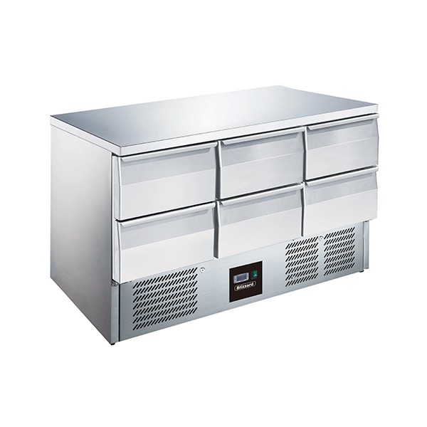 The Blizzard BCC3-6D compact counter refrigerator has 6 drawers that will accept GN1/1 containers and designed for use in commercial kitchens and a popular choice for pubs, restaurants, care homes, hospitals and schools. Manufactured from high grade 304 stainless steel, both internally & externally, this space saving stainless steel worktop prep counter refrigerator features a digital Dixel controller, with temperature display, fan assisted cooling for fast temperature pull-down times and adjustable feet for easy levelling, making this a great choice for any professional kitchen and covered with a 3 year warranty.