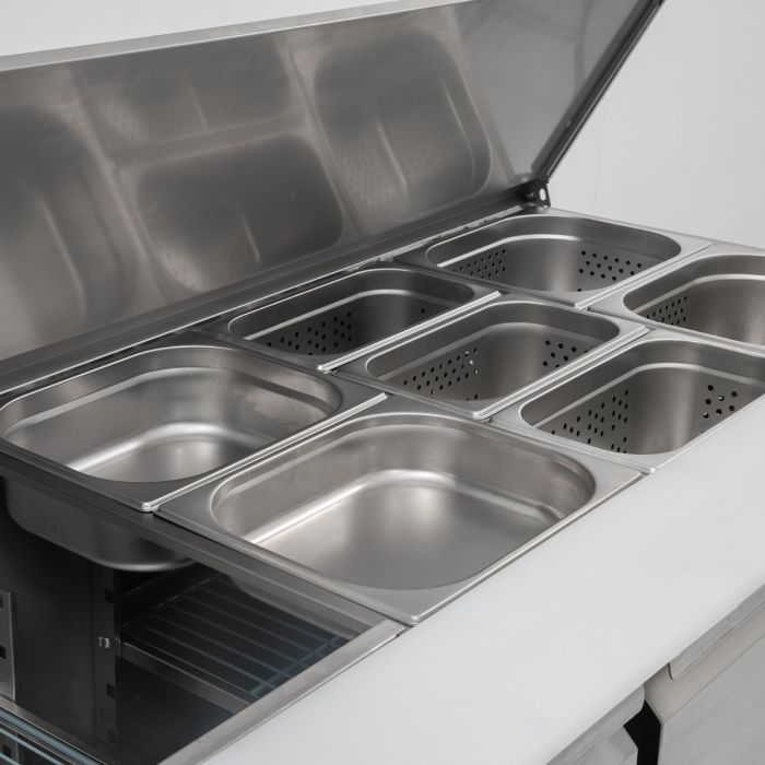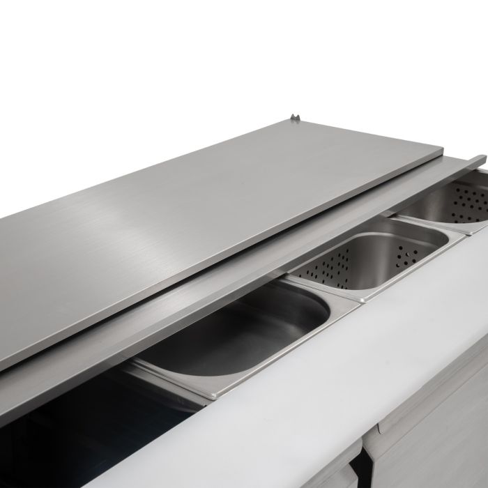 At the top, the unit features a full GN well cover that lifts on a hinge for quick and easy access. This cover helps protect ingredients when not in use, while still allowing convenient handling during food preparation. The GN well accommodates a variety of containers, giving you flexibility in how you store and organise your fresh produce. The station also includes a robust polypropylene cutting board fitted as standard. Ensuring you always have a safe and hygienic surface for preparation tasks.
