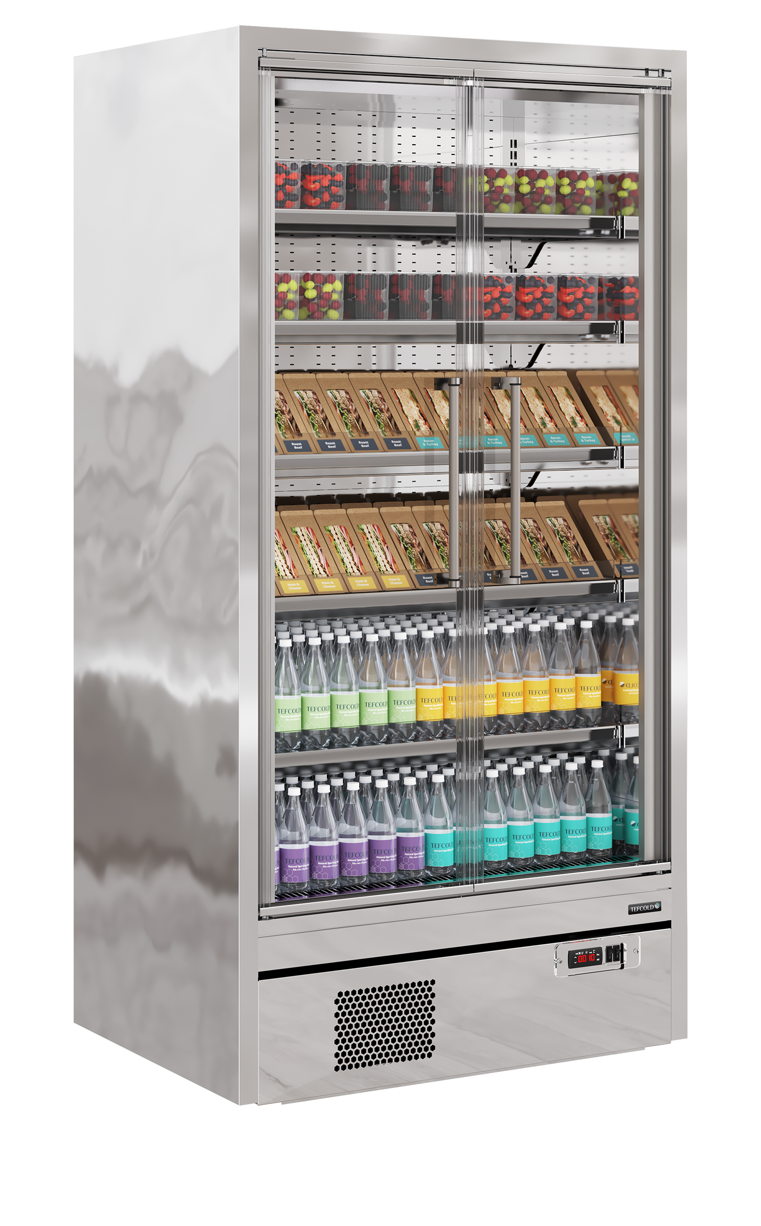 The TEFCOLD Galaxy+ FGD (Full Glass Door) range, finished in mirror stainless steel: our latest innovation in plug-in multidecks. We’ve combined an expanded display area and optimised cabinet efficiency with frameless, full-vision glass doors, offering enhanced product visibility that captures customers’ attention. The ultra-low front and slim top canopy provide an extra 100mm of internal height, accommodating up to 5 shelves (plus base) as standard. With a depth of only 740mm, the unit fits through standard doors for easy installation, yet has 400mm deep shelves for maximum stock capacity. Thanks to the carefully designed refrigeration system and optimal airflow throughout the cabinets, all sizes in this range are rated B for energy efficiency. Each unit comes with heavy-duty adjustable shelves that can be tilted if needed, EPOS ticket strips and shelf risers as standard. Optional extras include glass end-walls and multiplexing kits.