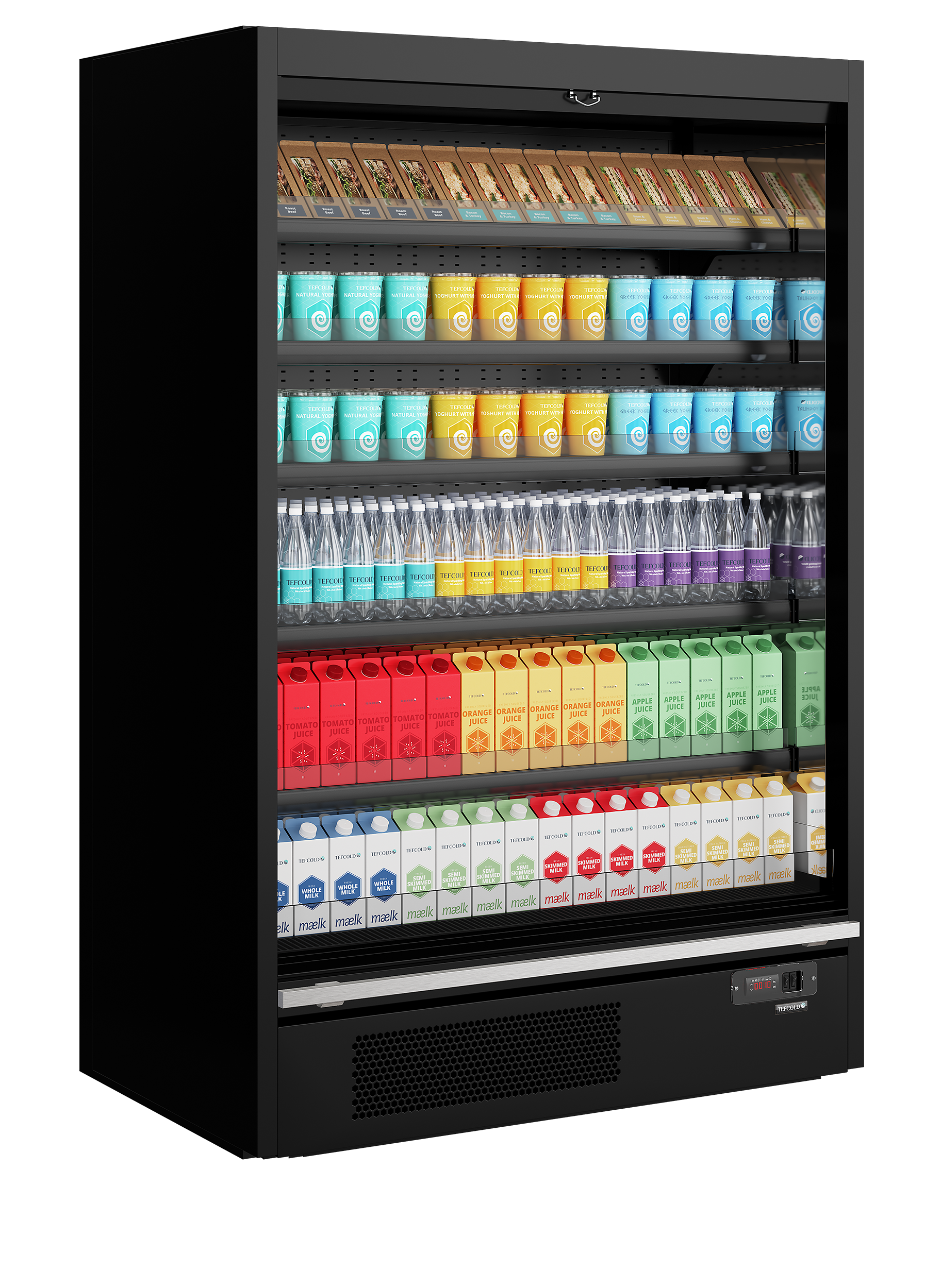 The TEFCOLD Galaxy+ open front is our latest innovation in plug-in multidecks. We’ve combined an expanded display area and optimized cabinet efficiency that easy access to customers for impulse buys with excellent lighting LED lighting. The cabinets come with 39mm EPOS ticket strips together with shelf risers as standard. The 5 Shelves can be angled at 7 or 15 degrees to give more options for merchandising and creating an attractive display for your customers. The Galaxy+ open range is suitable for fresh meat, dairy and drinks. It is ideal for use in supermarkets, convenience stores, farm shops, delis and sandwich shops.