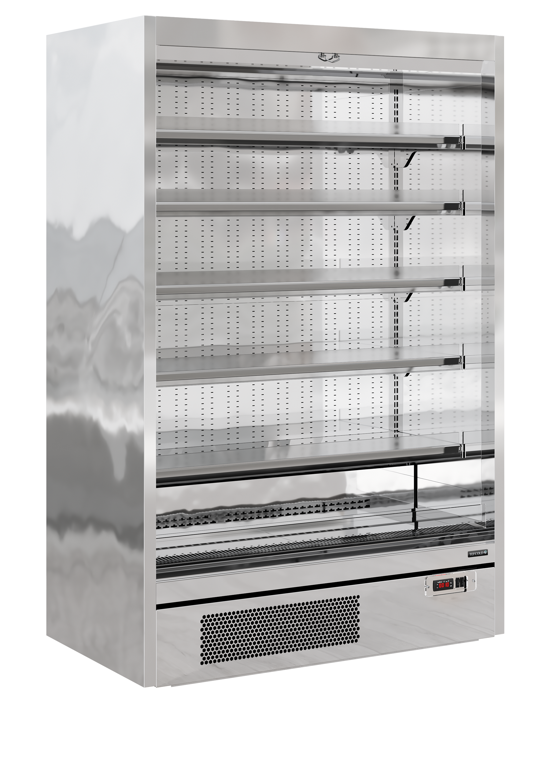 The TEFCOLD Galaxy+ range, finished in mirror stainless steel: our latest innovation in plug-in multidecks. We’ve combined an expanded display area and optimised cabinet efficiency. The ultra-low front and slim top canopy provide an extra 100mm of internal height, accommodating up to 5 shelves (plus base) as standard, all while maintaining an overall height of just 2040mm. With a depth of only 740mm, the unit fits through standard doors for easy installation, yet has 400mm deep shelves for maximum stock capacity. Each unit comes with heavy-duty adjustable shelves that can be tilted if needed, as well as EPOS ticket strips and shelf risers as standard. Optional extras include glass end-walls and multiplexing kits.