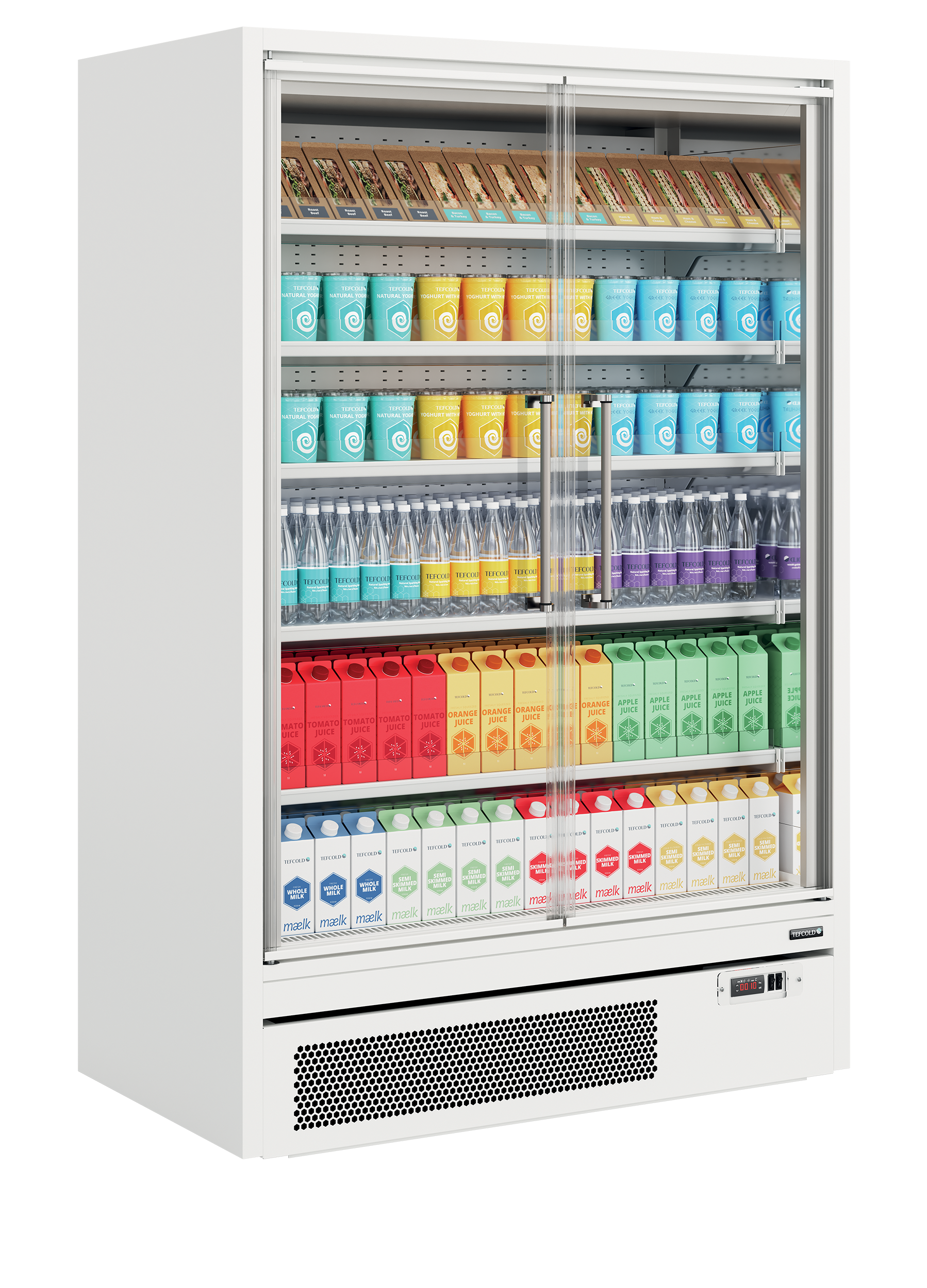 The TEFCOLD Galaxy+ FGD (Full Glass Door) range: our latest innovation in plug-in multidecks. We’ve combined an expanded display area and optimised cabinet efficiency with frameless, full-vision glass doors, offering enhanced product visibility that captures customers’ attention. The ultra-low front and slim top canopy provide an extra 100mm of internal height, accommodating up to 5 shelves (plus base) as standard. With a depth of only 740mm, the unit fits through standard doors for easy installation, yet has 400mm deep shelves for maximum stock capacity. Thanks to the carefully designed refrigeration system and optimal airflow throughout the cabinets, all sizes in this range are rated B for energy efficiency. Each unit comes with heavy-duty adjustable shelves that can be tilted if needed, as well as EPOS ticket strips and shelf risers as standard. Optional extras include glass end-walls and multiplexing kits.