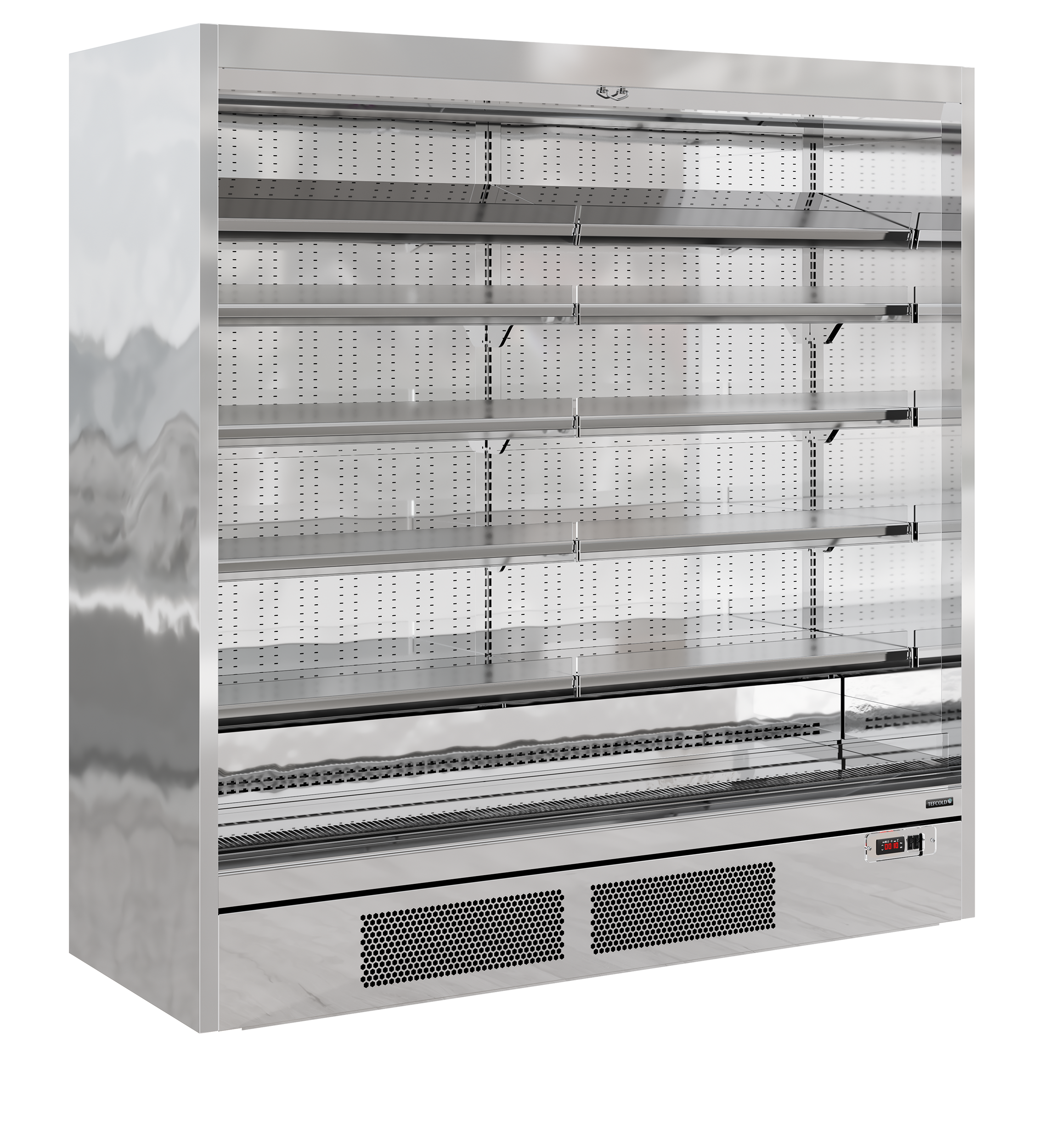 The TEFCOLD Galaxy+ range, finished in mirror stainless steel: our latest innovation in plug-in multidecks. We’ve combined an expanded display area and optimised cabinet efficiency. The ultra-low front and slim top canopy provide an extra 100mm of internal height, accommodating up to 5 shelves (plus base) as standard, all while maintaining an overall height of just 2040mm. With a depth of only 740mm, the unit fits through standard doors for easy installation, yet has 400mm deep shelves for maximum stock capacity. Each unit comes with heavy-duty adjustable shelves that can be tilted if needed, as well as EPOS ticket strips and shelf risers as standard. Optional extras include glass end-walls and multiplexing kits.