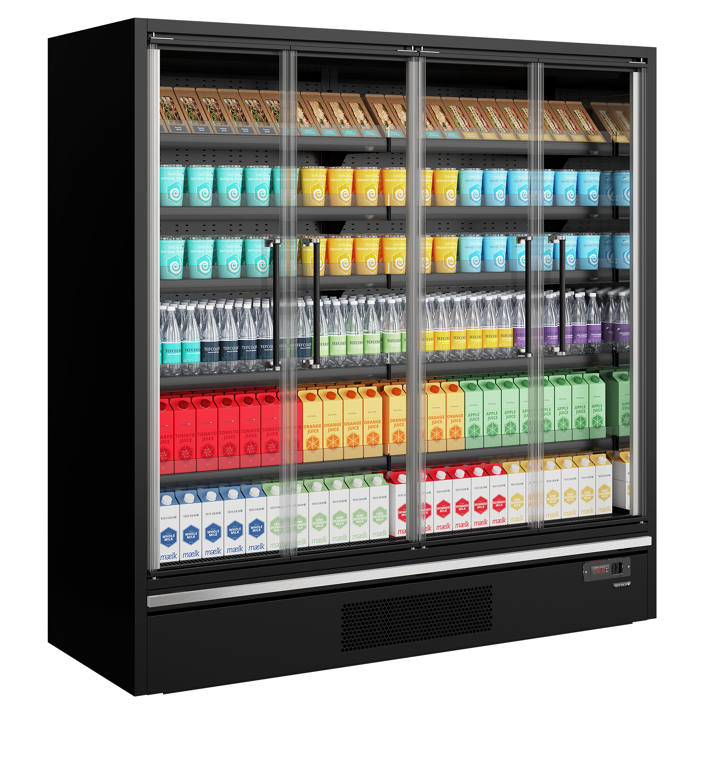 The TEFCOLD Galaxy+ FGD (Full Glass Door) range: our latest innovation in plug-in multidecks. We’ve combined an expanded display area and optimised cabinet efficiency with frameless, full-vision glass doors, offering enhanced product visibility that captures customers’ attention. The ultra-low front and slim top canopy provide an extra 100mm of internal height, accommodating up to 5 shelves (plus base) as standard. With a depth of only 740mm, the unit fits through standard doors for easy installation, yet has 400mm deep shelves for maximum stock capacity. Thanks to the carefully designed refrigeration system and optimal airflow throughout the cabinets, all sizes in this range are rated B for energy efficiency. Each unit comes with heavy-duty adjustable shelves that can be tilted if needed, as well as EPOS ticket strips and shelf risers as standard. Optional extras include glass end-walls and multiplexing kits.