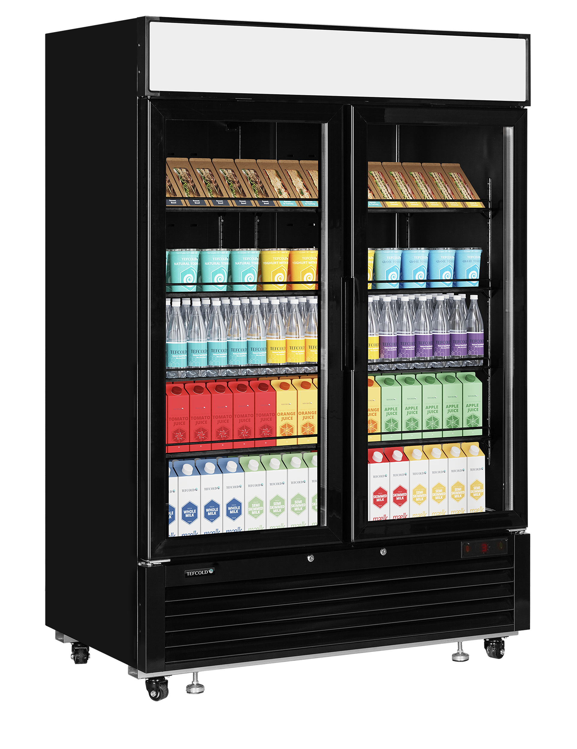 The TEFCOLD LGC5000 chiller now available in a sleek black finish. This exciting update allows the unit to seamlessly blend into various retail and catering environments, making it an excellent choice for establishments seeking a sophisticated and high-quality aesthetic. Each door boasts two vertical LED light strips, these draw attention to the product on display giving a striking contrast against the black interior of the cabinet. There is also an LED light canopy which is ideal for branding and advertising. The unit’s interior base is manufactured from stainless steel and features curved corners to help with cleaning and hygiene. Additionally, the carefully engineered refrigeration system is highly energy-efficient, minimising operational costs while keeping your products at their optimal temperature. The unit is also fitted with castors, to allow moving for cleaning purposes and other necessary adjustments.