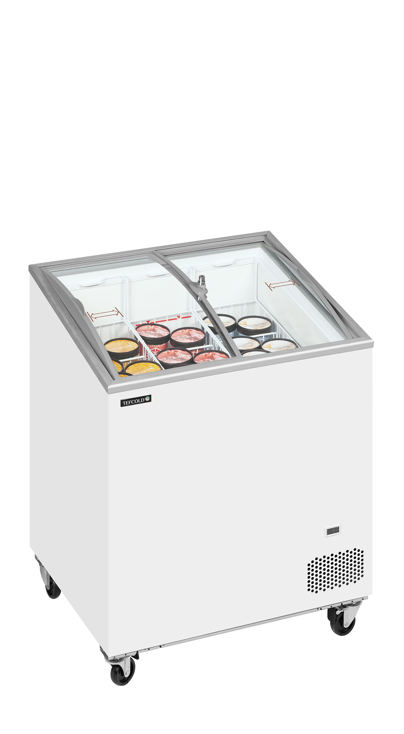 An excellent choice of sliding glass lid chest freezers, similar to the IC-SC range but with a sloping top for a better visual display and curved lids which always look better. Ideal for display of frozen food including ice cream and lollies. Sturdy heavy duty castors are fitted to enable easy movement of the cabinet, two of the four castors are lockable. Excellent adjustment of the temperature means you can hold a temperature around -14°C, ready to serve ice cream, or down to -24°C for other frozen food. The unit comes with a lock as standard and a defrost drain for easy cleaning. The unit also has a fan assisted condenser for efficient operation. A full set of baskets with dividers supplied as standard (except IC101SCEB which does not come with dividers). A firm favourite with many ice cream companies. (A glass canopy version for scooping ice cream is also available).