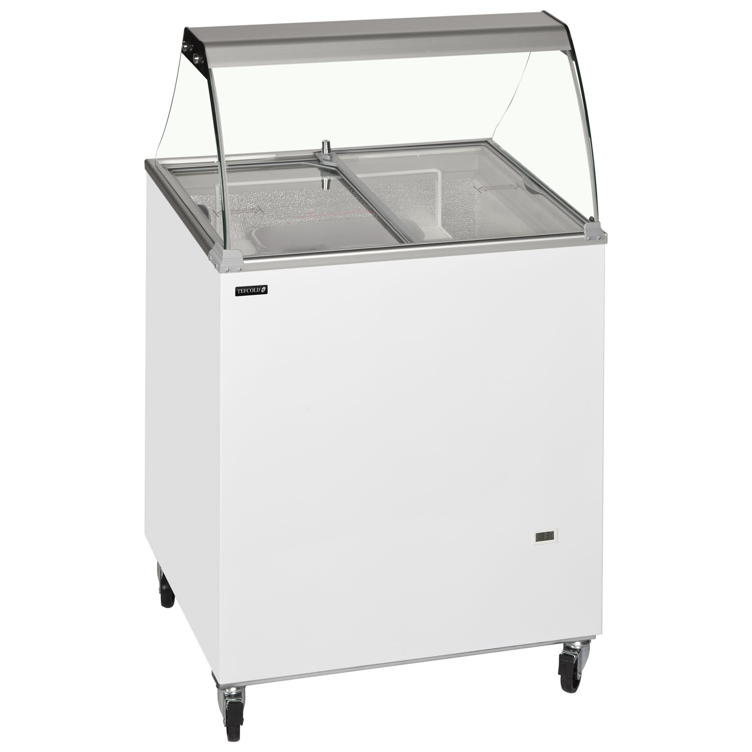 The IC200SC+CANOPY offers static cooling, mobility castors, a security lock, and a digital temperature display for precise control. The flat sliding lids and curved glass canopy provide easy access and product visibility. With a fan-assisted condenser for energy efficiency and storage space under the tubs, this display is practical and convenient. Easy to clean with a defrost drain and hassle-free with its acceptance of plastic Napoli size tubs, the IC200SC+CANOPY is perfect for your ice cream needs.