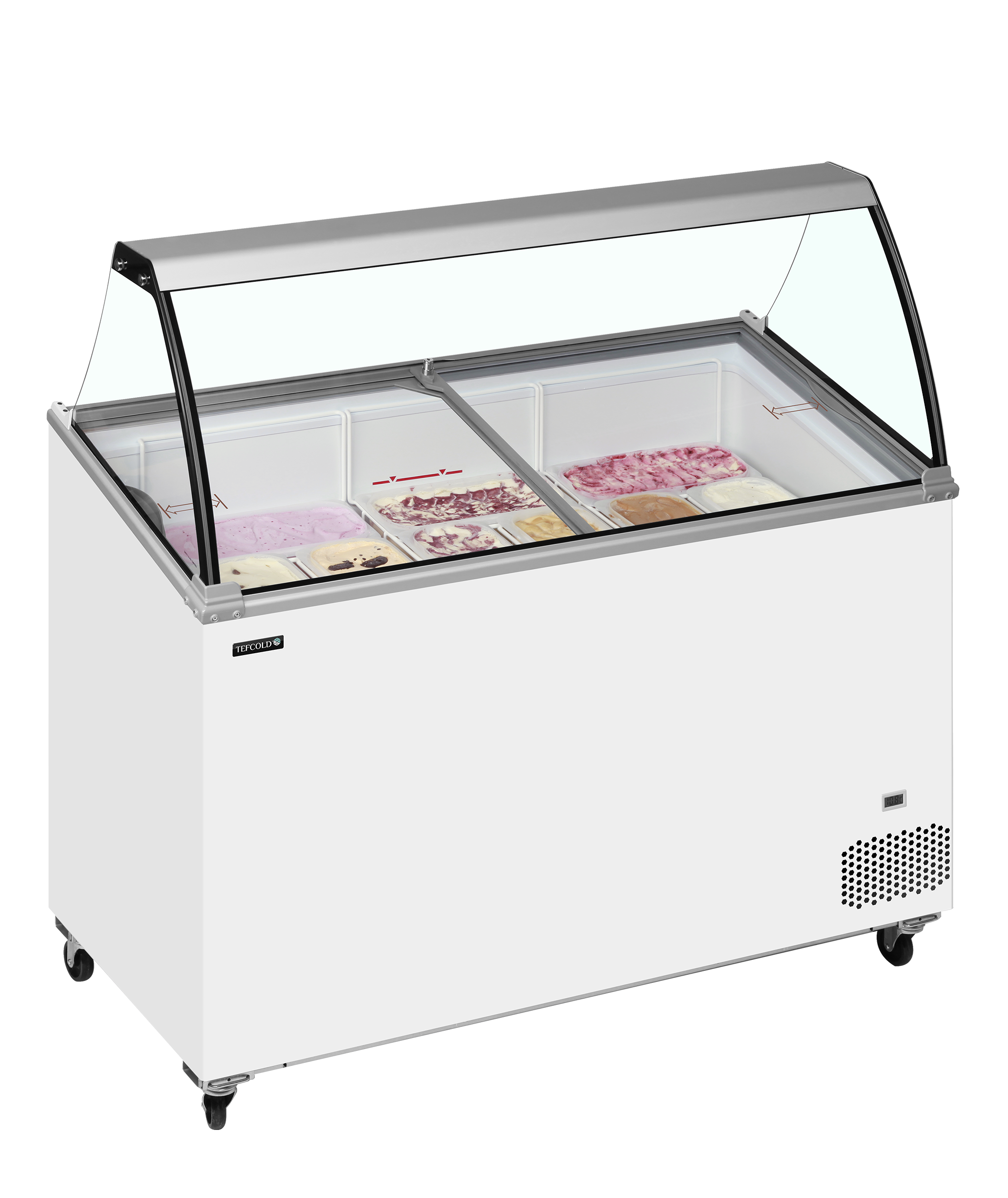 The IC401SCE + CANOPY features a curved glass canopy and angled sliding lids with locks for optimal product visibility and security. Perfect for branding, it offers storage under baskets, a digital thermometer, and castors with brakes for easy mobility. With a climate class 5 rating, it excels in high performance even in warm environments. Say goodbye to stainless Napoli pans – this unit accepts plastic Napoli size tubs.