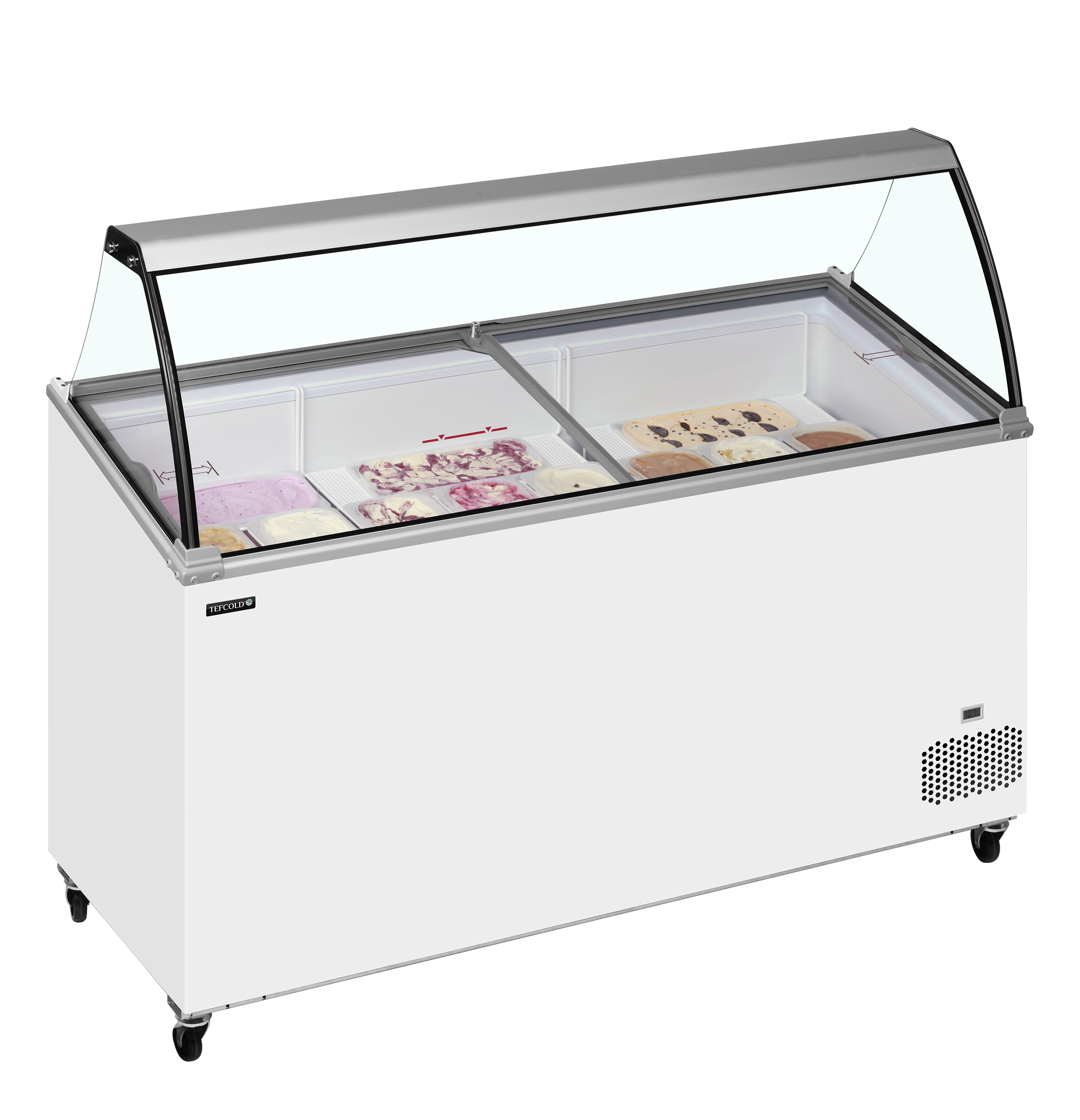 The IC501SCE + CANOPY features a curved glass canopy and angled sliding lids with locks for optimal product visibility and security. Perfect for branding, it offers storage under baskets, a digital thermometer, and castors with brakes for easy mobility. With a climate class 5 rating, it excels in high performance even in warm environments. Say goodbye to stainless Napoli pans – this unit accepts plastic Napoli size tubs.