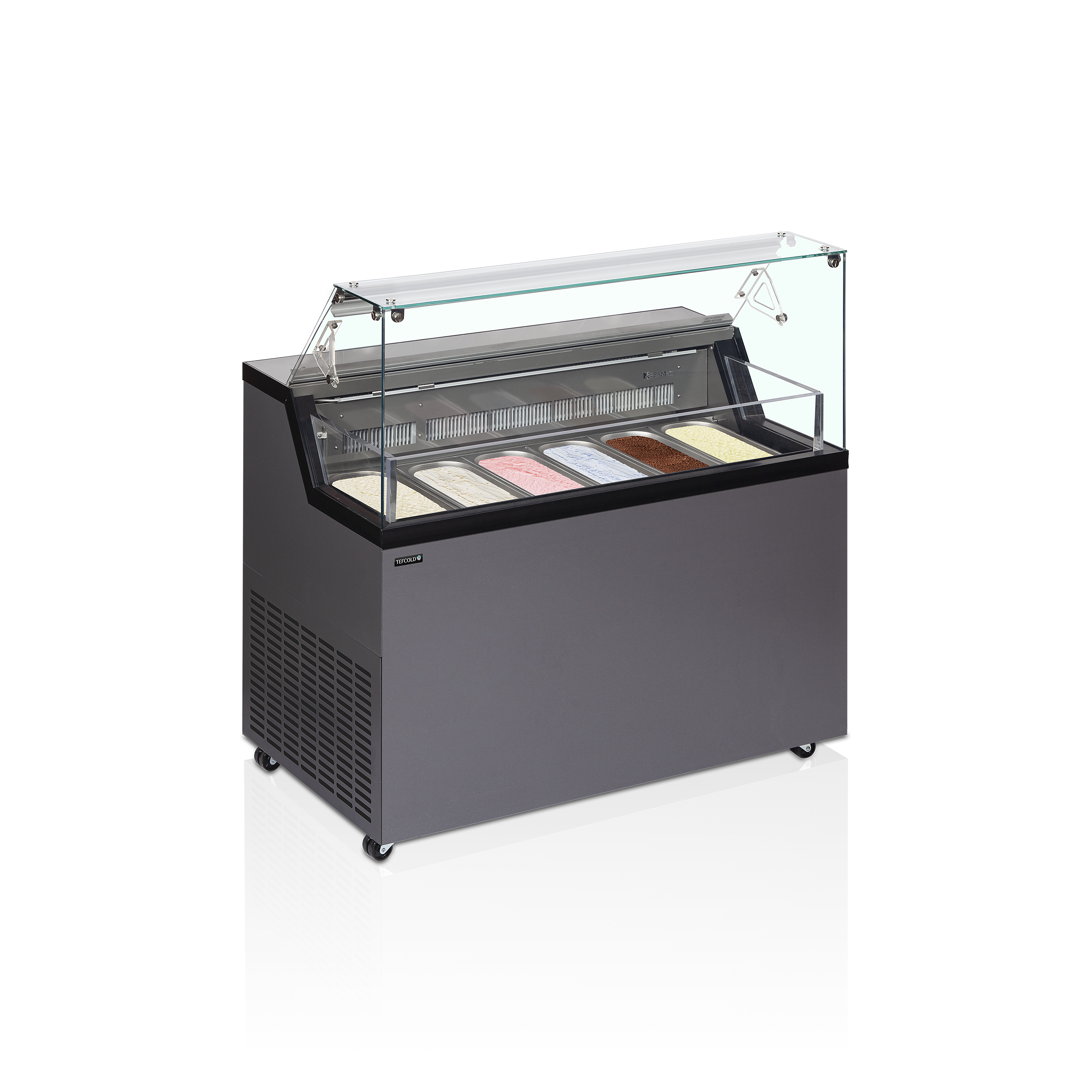 The Framec Mirabella ice cream scooping display is a leap forward in design and presentation. The Mirabella is designed to hold the ice cream as high as possible in the display giving the easiest view of the product to the customer. Traditional scooping units hold the ice cream further down within the cabinet making it harder (especially for children) to see the ice cream. It also ensures the ice cream is visible from further away, helping to draw customers in. Maximise sales and profits by maximising your display. Available in 6, 7 and 9 pan versions, the Mirabella represents value, proven reliability and a class leading display.