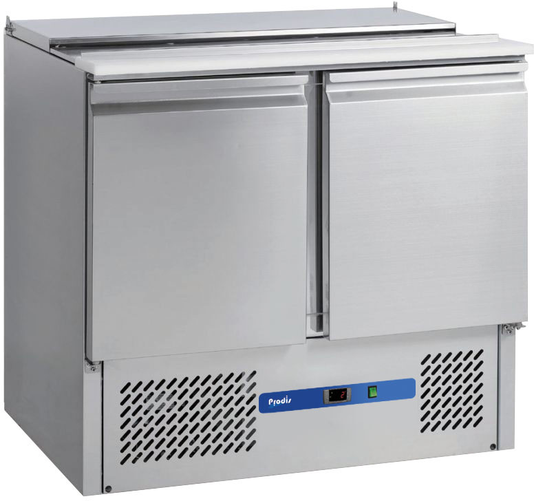The EC2SSLE by Prodis, a 2 door compact saladette counter with stainless steel work top and under mounted compressor. The EC series are ideal where space is limited and are available with a range of tops to suit any application from flat top for use as a work surface to prep tops with built in pan rails for salad, sandwich and pizza prep. All EC series counters benefit from a digital temperature controller and 1/1GN compatible shelving for flexibility.