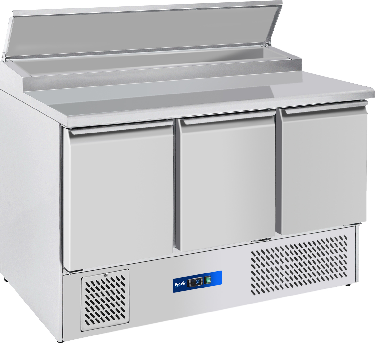 The EC3PREP-LE by Prodis, a 3 door compact prep counter with stainless steel work top and 8 x 1/6GN refrigerated topping well. The EC series are ideal where space is limited and are available with a range of tops to suit any application from flat top for use as a work surface to prep tops with built in pan rails for salad, sandwich and pizza prep. All EC series counters benefit from a digital temperature controller and 1/1GN compatible shelving for flexibility.