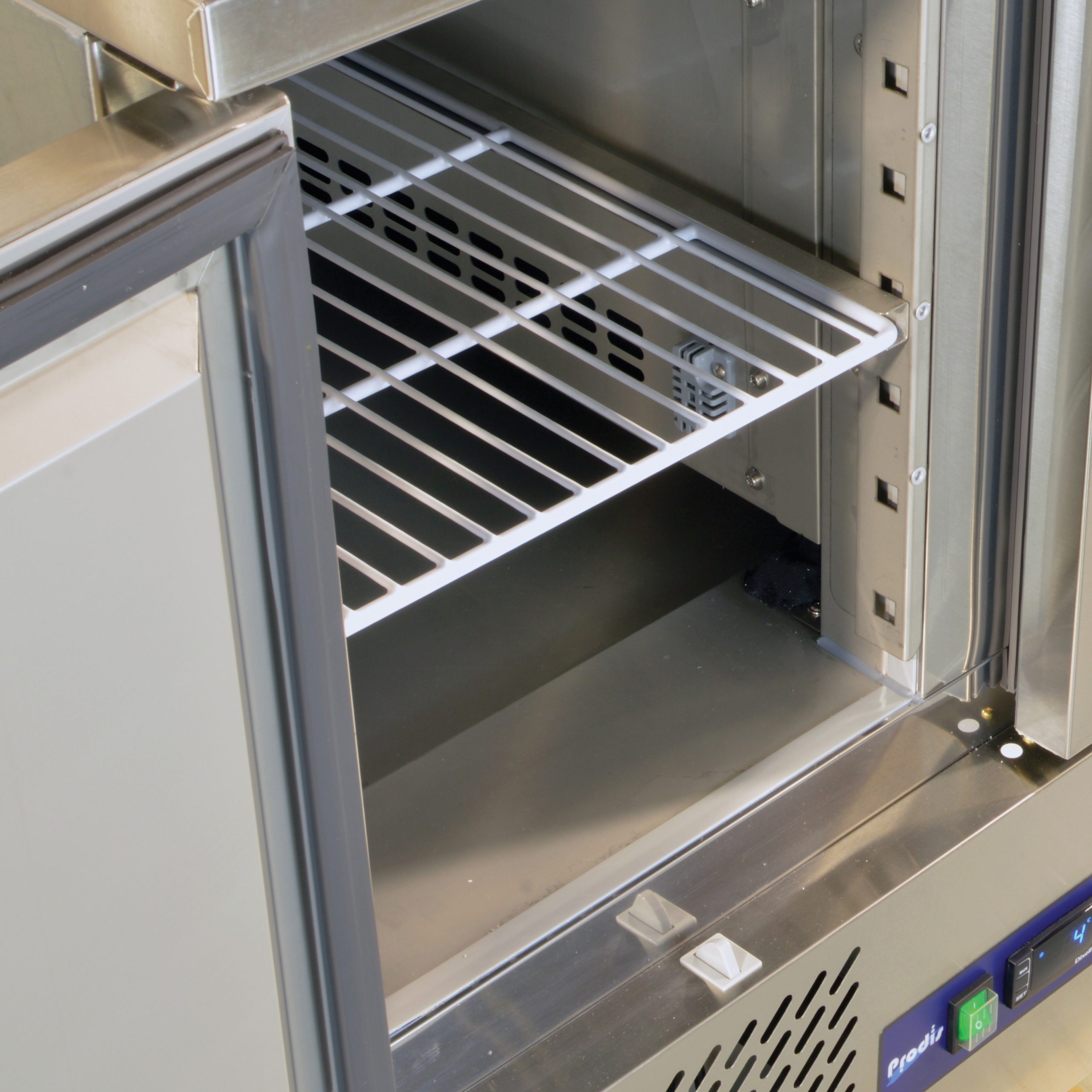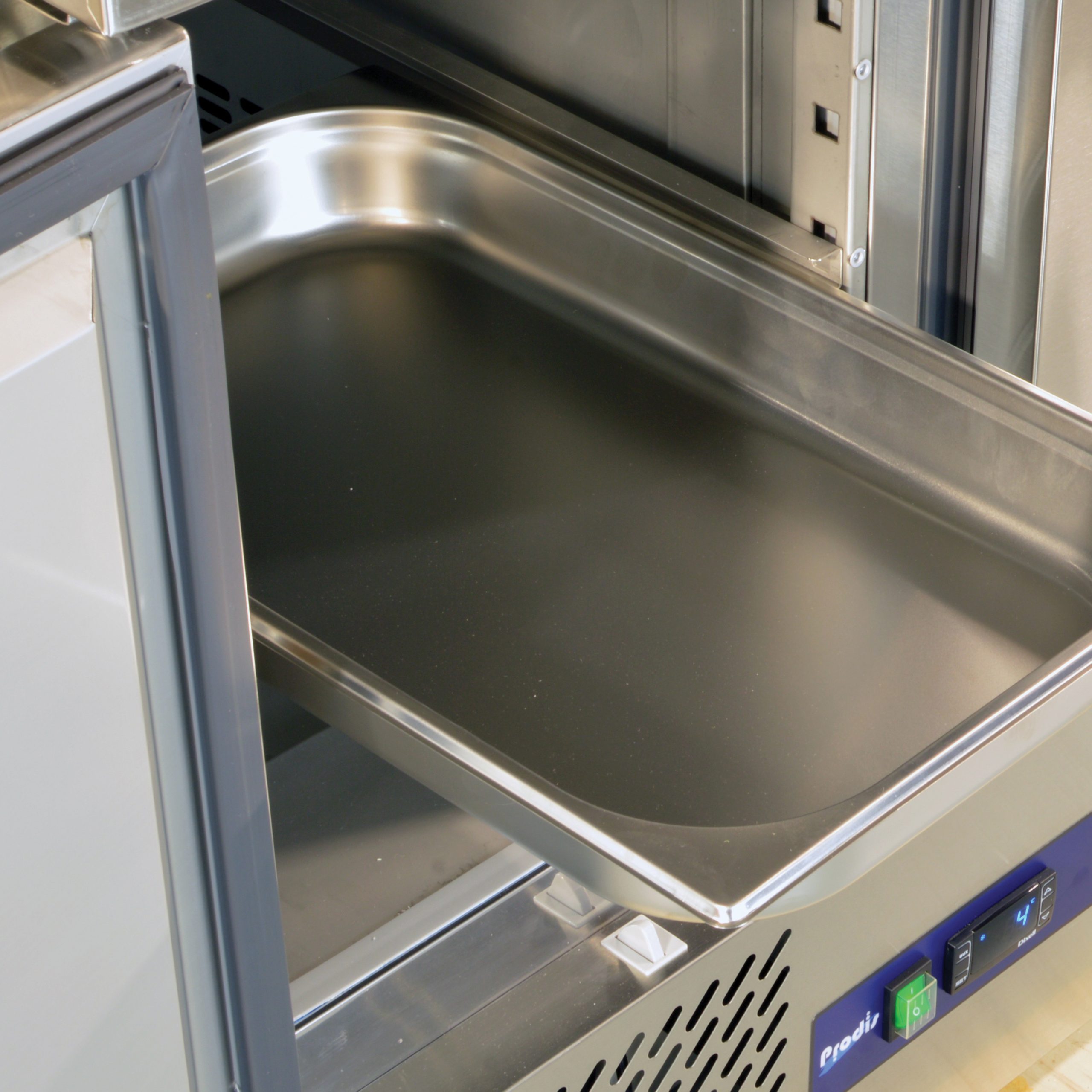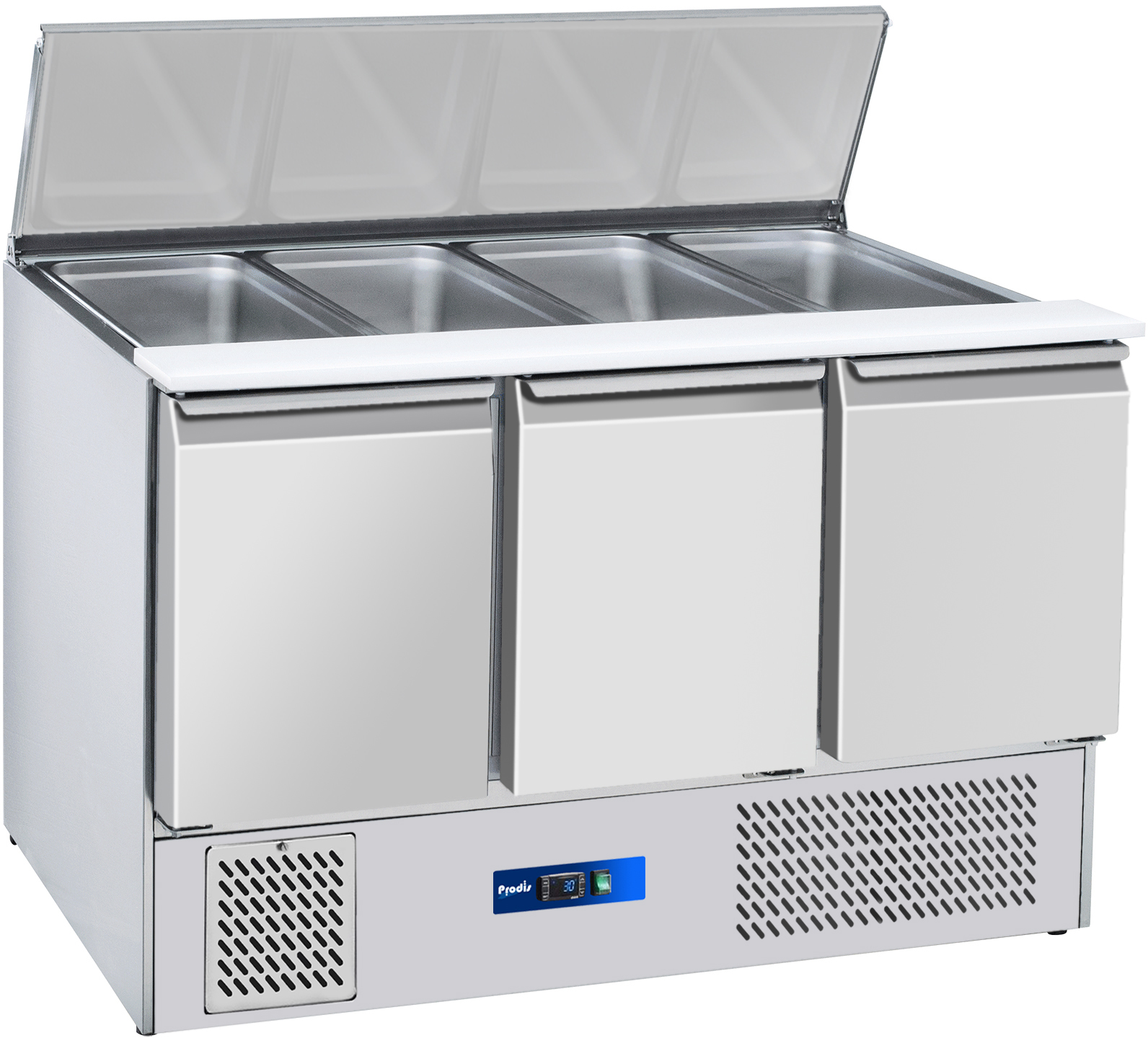 The EC3SALAD-LE by Prodis, a 3 door compact salad prep counter with stainless steel work top and 4 x 1/1GN refrigerated topping well. The EC series are ideal where space is limited and are available with a range of tops to suit any application from flat top for use as a work surface to prep tops with built in pan rails for salad, sandwich and pizza prep. All EC series counters benefit from a digital temperature controller and 1/1GN compatible shelving for flexibility.