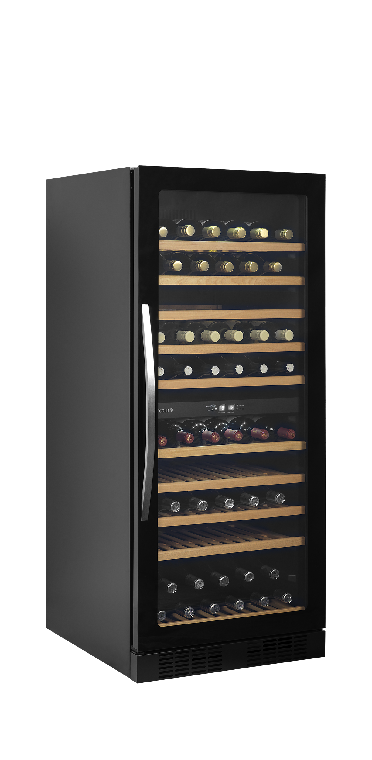 The TFW300-2F is a dual temperature wine cooler with “frameless” edge to edge glass door. Designed so you can store and display white and red wine at the correct temperature with white wine in the top half and red wine at the bottom. Slide out wooden shelves allow easy selection of wine. A re-designed refrigeration system helps keep the unit as quiet as possible and energy consumption low.